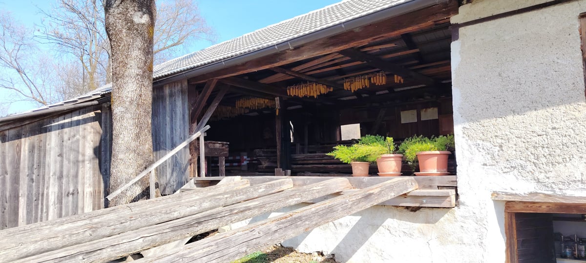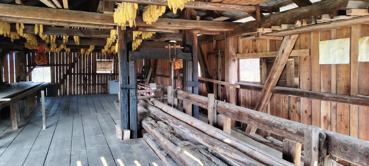 V prostoru žage visijo tudi povezani storži koruze, kakor so viseli nekoč po kmetijah, da so se posušili. Kmalu, v začetku aprila, bodo člani društev vabili na ročno luščenje te koruze, kar prav tako prenašajo na mlade. Zasadili so namreč svojo njivo koruze, da opravljajo celoten postopek od setve do mletja. Po spravilu z njive je jeseni spet živahno pri mlinu in žagi, saj vabijo na družabno ličkanje oziroma kožuhanje koruze. Meljejo sicer v mlinu zelo redko. "Težko je potem vse skupaj temeljito sčistiti, da se ne pojavijo majhne živalce, miške," pojasni Kotnik.