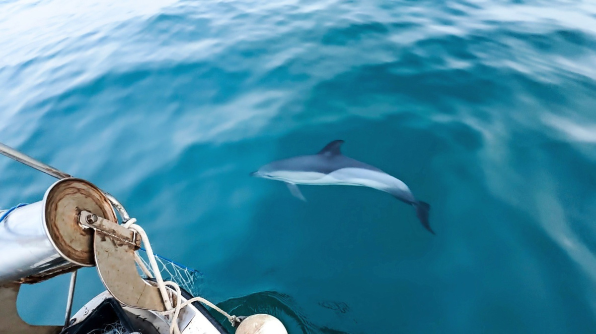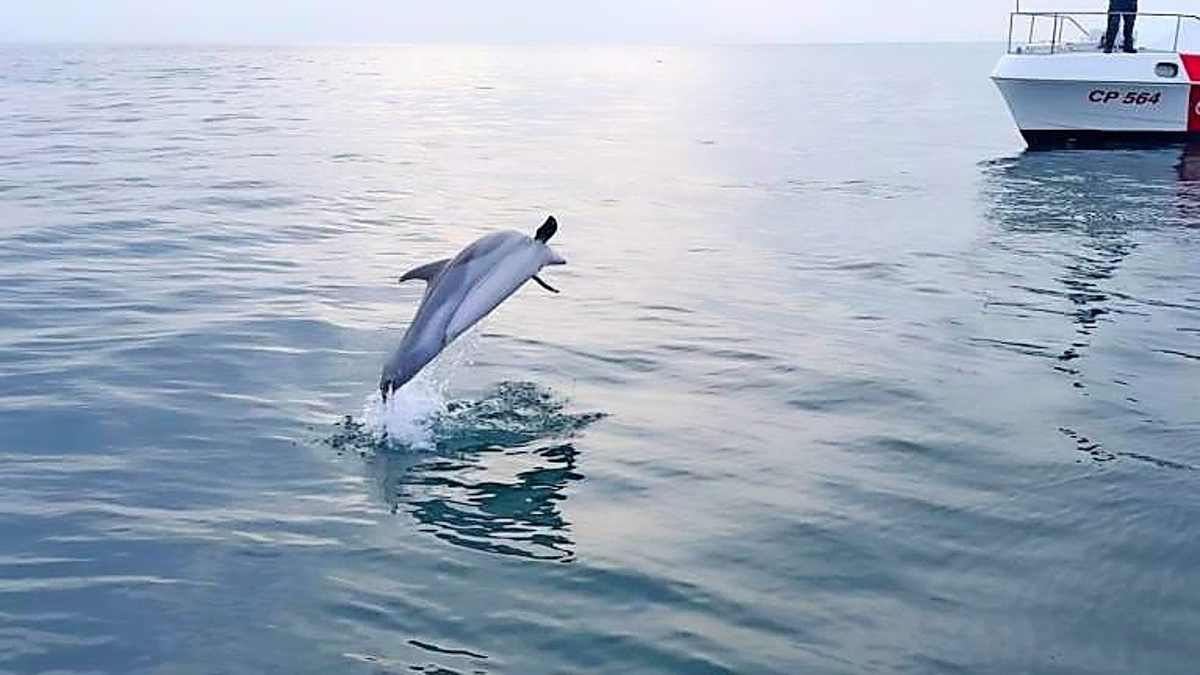 Med napornim delom pa so raziskovalci in pripadniki obalne straže dobili nenapovedan obisk: k njim je zaplavala samica navadnega delfina (Delphinus delphis), ki je v preteklih tednih že obiskala zalivček pri Grljanu. Raziskovalce je skrbelo, da bi se delfinka, ki se sama potika po Tržaškem zalivu, lahko zapletla v mrežo, a na srečo ni bilo tako. Z delom so raziskovalci in pripadniki luške kapitanije končali ob mraku. Del mreže se je sicer zagozdil na morskem dnu, zaradi česar bodo v naslednjih dneh, ko bodo vremenske razmere ugodnejše, z delom nadaljevali in na suho povlekli še preostanek ribiške mreže.