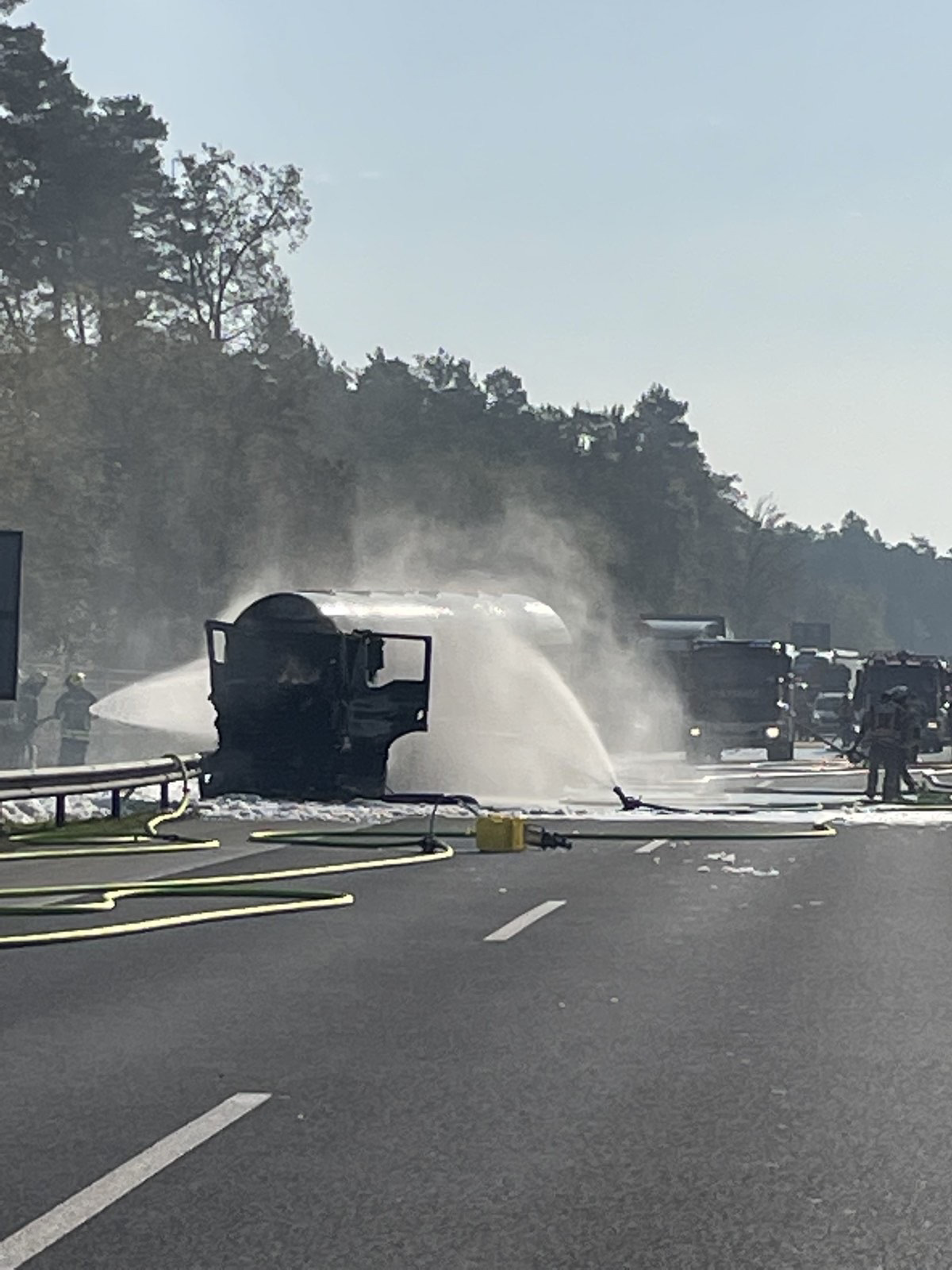 Okoli 9. ure sta na podravski avtocesti od Ptuja proti Mariboru trčili dve tovorni vozili, pri tem pa je eno od njih, cisterna, ki je prevažala kurilno olje, zagorelo.