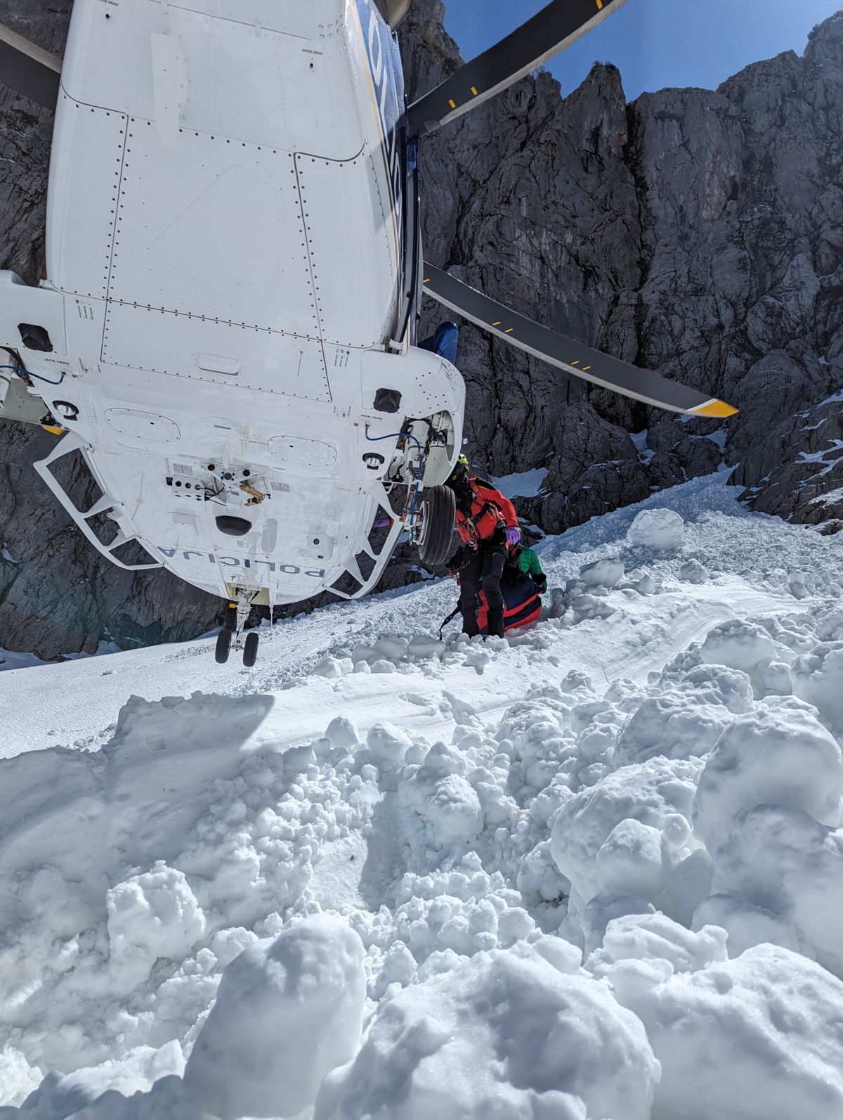 Po padcu je mlajši gornik obstal zakopan pod snegom plazovine. Posadka letalske policijske enote je z namensko helikoptersko žolno v izjemno kratkem času natančno locirala mesto, kjer je bil zasut ponesrečeni. Na kraju so takoj odložili gorskega reševalca in zdravnika ter nato prepeljali še dodatne gorske reševalce, ki so ponesrečenega locirali in odkopali izpod zelo težkega snega, a je zaradi hudih poškodb na kraju umrl. 44-letnik ni bil poškodovan. Oba so s policijskim helikopterjem prepeljali v dolino.