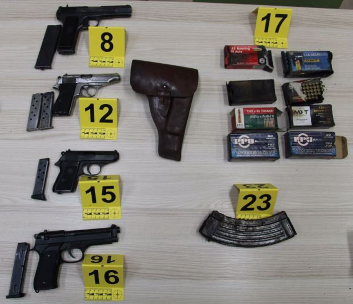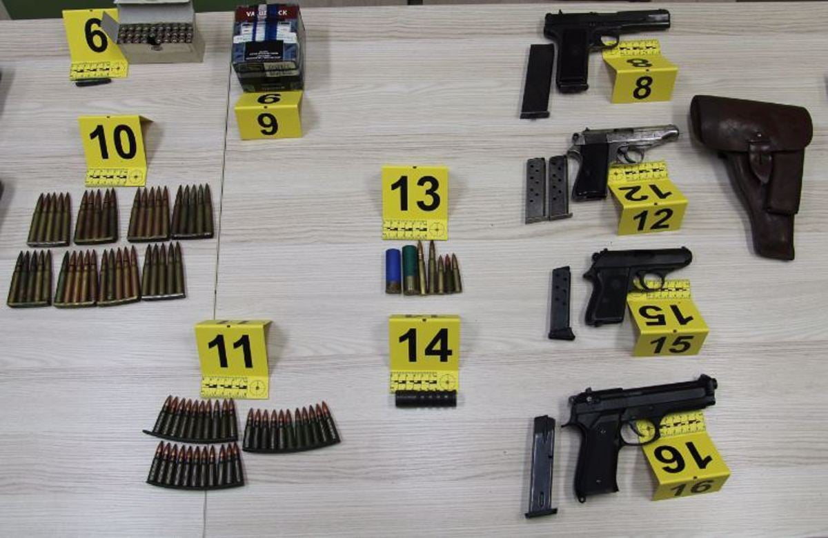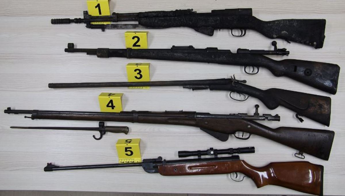 Med zaseženimi stvarmi je bilo pet pušk, med drugim polavtomatska puška s preklopnim bajonetom, štiri pištole s pripadajočimi nabojniki ter več kot 500 različnih nabojev.