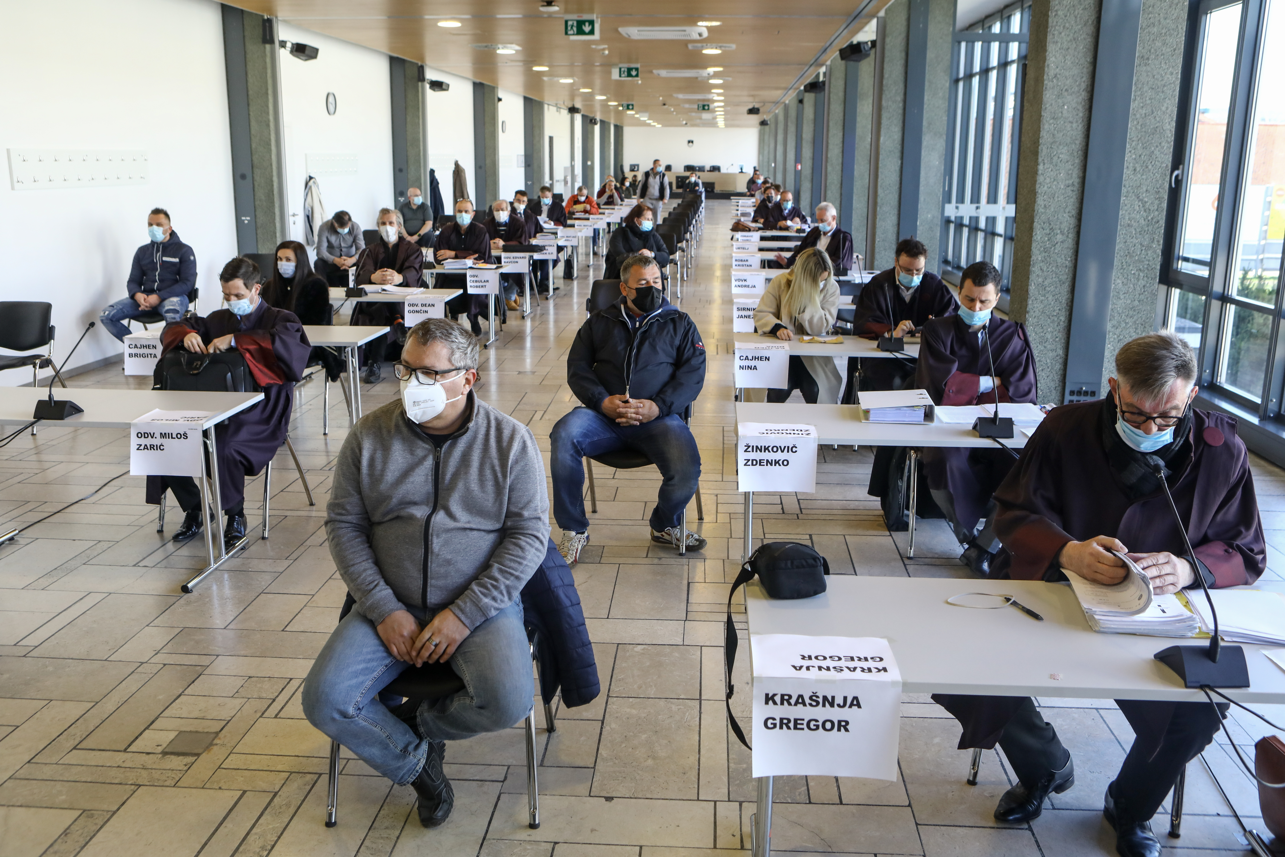 Četudi bi prav zaradi toliko obtoženih in zagovornikov morda lahko pričakovali kaos v dvorani, tega zaradi dobre organizacije ni bilo. Na mizah, v ogromni, sodobno opremljeni Galeriji jih je vsaj trideset, so jih čakali listi z njihovimi imeni, med seboj postavljenimi na varni razdalji, vsaka od njih je opremljena z mikrofonom. Kdor je sedel na stolih, postavljenimi za mizami in torej več deset metrov stran od sodnega senata na dvignjenem odru, težav s spremljanjem obravnave ni imel. Akustika v dvorani je namreč odlična, celoten prostor pa opremljen z osmimi TV-zasloni, ki omogočajo spremljanje osrednjega dogajanja. Dvorana je zaradi oken, vgrajenih po njeni celi levi dolžini, svetla, razgled se razprostira na ploščad, po kateri so včeraj številni hiteli na cepljenje.