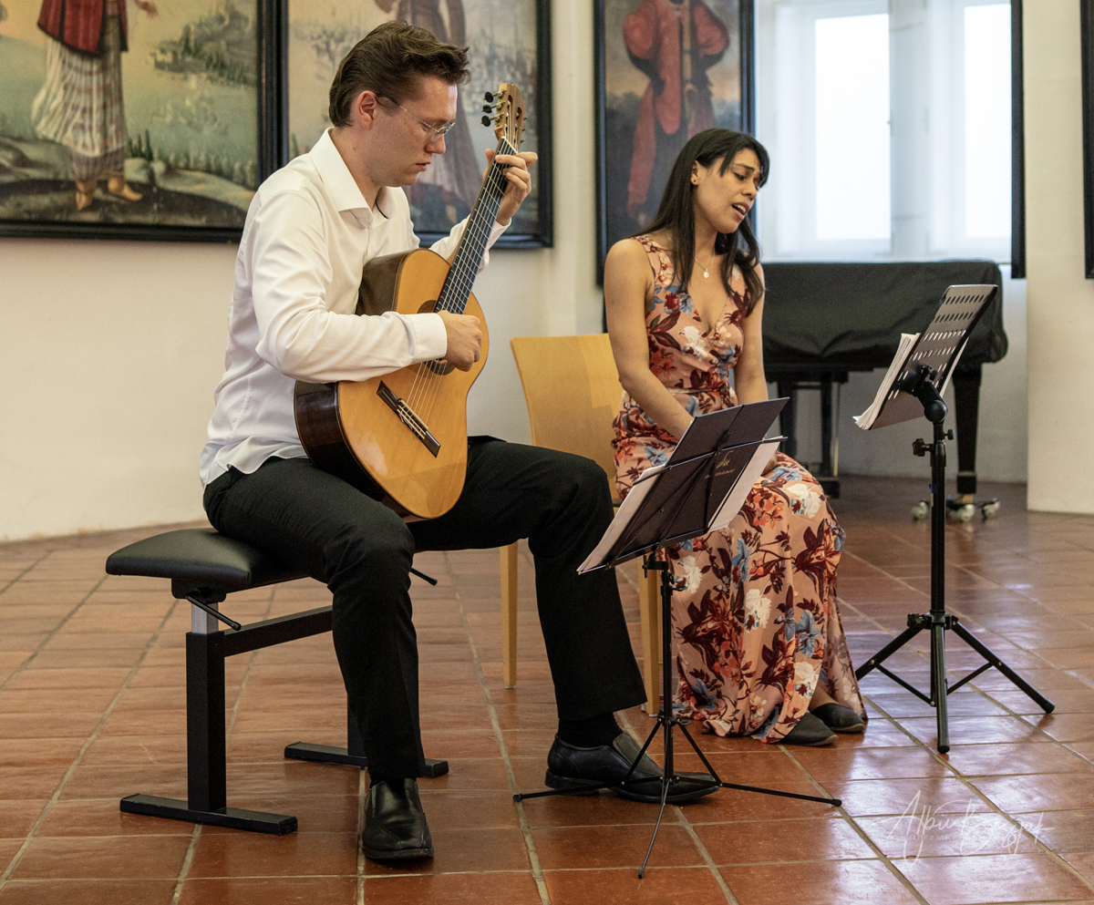 Mlada izvajalca sta oba diplomanta Kraljeve akademije za glasbo v Londonu. V duu delujeta tri leta. Predstavila sta samospeve ali pesmi treh skladateljev 18. stoletja: Fernanda Paëra, Wolfganga Amadeusa Mozarta in Maura Giulianija; dveh iz 19. stoletja: Gabriela Fauréja in Heitorja Ville-Lobosa; ter dveh iz 20. stoletja: Joaquína Rodriga in mlajšega Bernarda Simõesa, ki je bil na koncertu prisoten. Skupno z dodatkom 16 skladb. Sopranistko Gómezovo odlikuje bogata barva v vseh legah. Kitarist Kurtjak jo je subtilno spremljal. Slišali smo tudi dve praizvedbi mladega skladatelja Simõesa, ki je poslušalce tudi pozdravil in nagovoril.