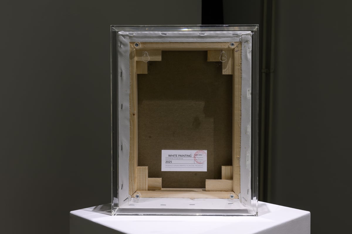 V naslednjem prostoru se srečamo z enim samim delom, White Painting (2025), nastalem po rauschenbergovskem navdihu. Gre za (še vedno oziroma za vedno) v plastiki zapakirano in na podokvir napeto surovo platno. Umetnikova gesta nedotaknjeni produkt zapre v pleksi steklo. Zdi se, da to delo še bolj potencira občutek brezčasnosti, na katero gledalec naleti ob umetnikovih delih in ki se kaže kot konsistentna eliptičnost pri predstavitvi stvaritve. To delom daje specifično kvaliteto, ki se kaže v deloma nevtralnih, deloma hladnih občutkih, ki se porajajo ob izkustvu del. Umetnik ne spregleda niti ene same nadrobnosti.