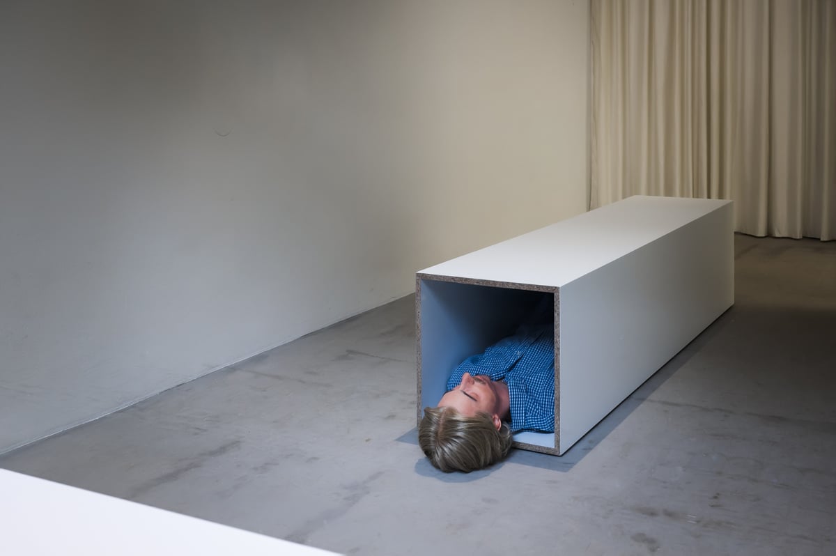 Formalno skromno in izčiščeno je tudi umetnikovo najprepričljivejše delo Selfie (2025). Gre za produkcijsko, semantično in doživljajsko najkompleksnejše delo, pri čemer mi je umetnik sam pomagal razumeti pot, kako je do njega sploh prišlo. Štibernik je namreč za razstavo Making it. Making what? (2025) v Galeriji P74 ustvaril delo z naslovom Delo je treba poiskati (2024), za katero je klasično obliko kiparskega podstavka prevrnil na bok – ambigviteta precej velikega kvadra je tako tudi zaradi skrbno premišljenih dimenzij obiskovalce prej spomnila na muzejsko klop kot na podstavek. Poleg tega je Štibernik po prejemu nagrade izvedel javnosti neviden performans Rojstvo ali smrt umetnika (2024), v katerem se je v kvader ulegel – to je ovekovečila le fotografija. Dokument performansa je v naslednjem letu uporabil kot motiv za izvedbo silikonske prostetične lutke svoje/umetnikove glave. Svojo hiperrealistično podobo je pozneje razstavil v prostoru Prepih, za katerega sam zanimivo pravi, da je po eni strani ostal prazen – dokler gledalec na drugi strani "klopi" ni zagledal umetnikove glave –, po drugi strani pa je postal nekakšna mrliška vežica s klopjo in z umetnikovo navzočnostjo pokrita krsta. Sam tudi pravi, da se je po eni strani rodil, ker je bil z nagrado in razstavo v MSUM legitimiziran, po drugi strani pa je umrl. Toda kljub dvojnikovi srhljivi navzočnosti v Tkalki se nam avtor ponovno izmuzne.