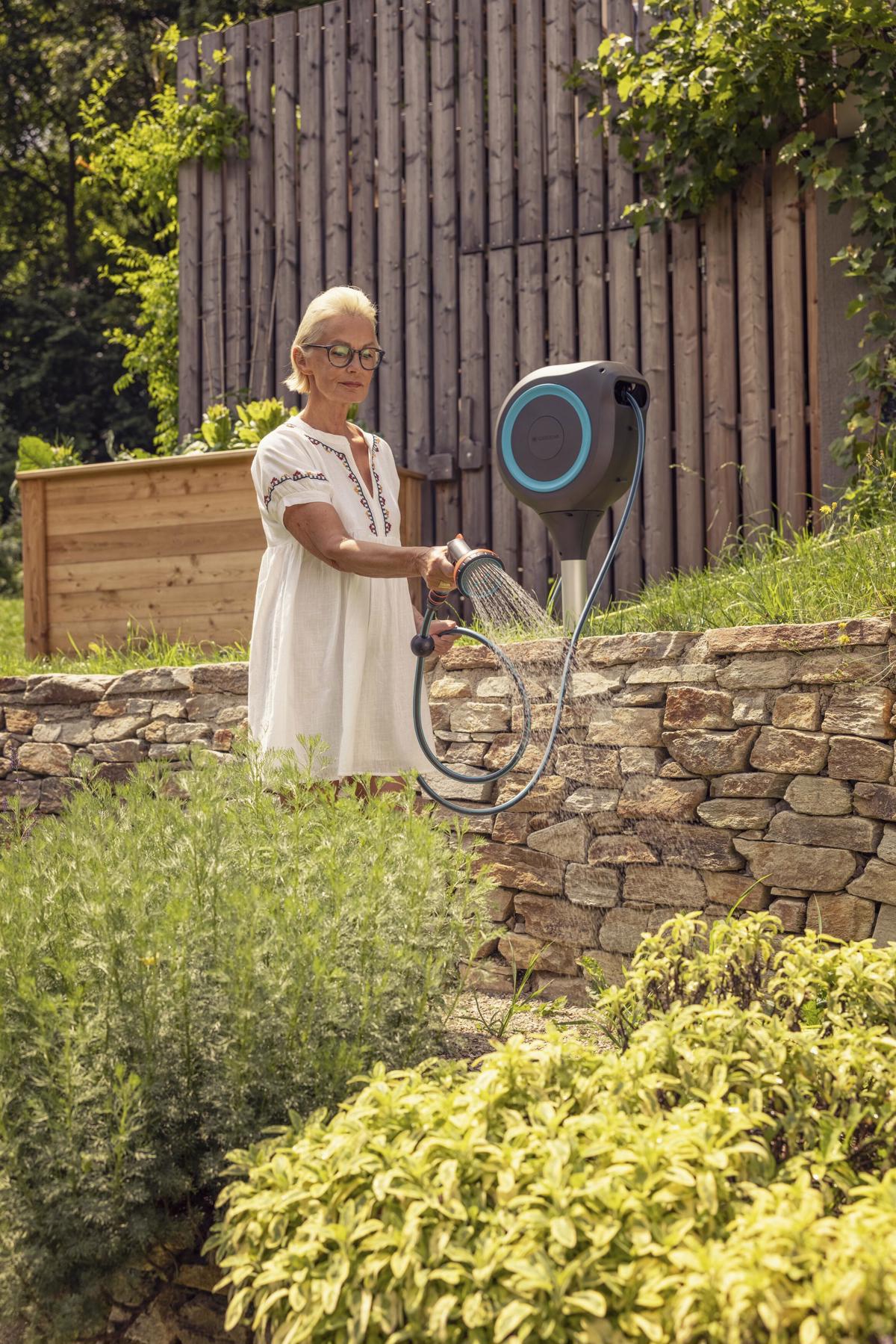 Če je vaš vrt zasnovan tako, da je treba po ovinkih okrog rastlinskih nasadov, ali pa ima obilo raznolikih zelenih kotičkov, morda potrebujete mobilno rešitev. "Za mobilno uporabo vam bo v pomoč vrtni voziček za cev. Velika kolesa pripeljejo cev daleč na vrt in omogočajo priročno zalivanje oddaljenih površin. Inovativna funkcija Kick&Stand poskrbi za stabilnost, zato se voziček med delom ne prevrača. Omogoča kompaktno in prostorsko varčno shranjevanje vrtne cevi in lagoden transport," še povedo pri Gardeni.