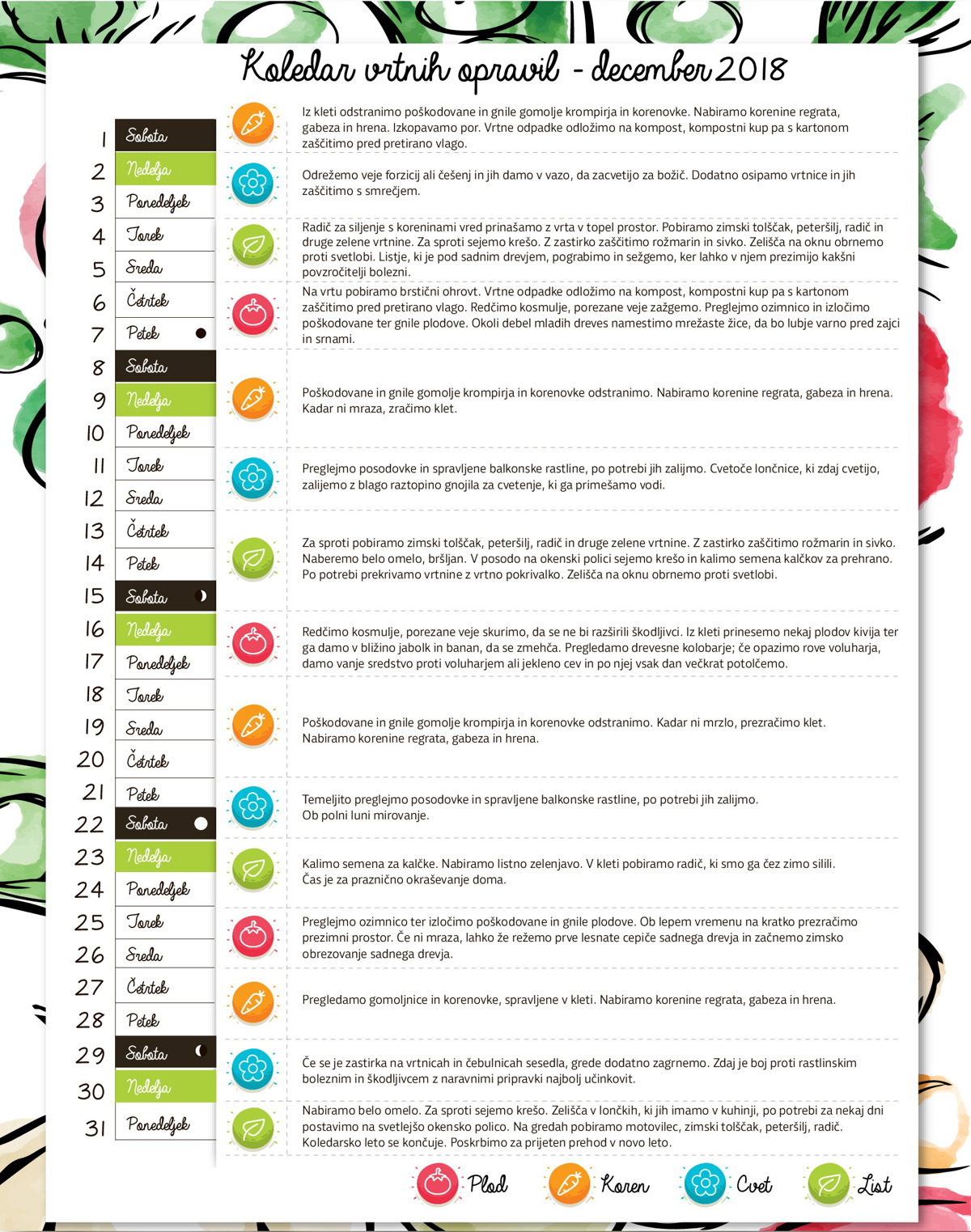 Po starem rimskem koledarju je bil december deseti mesec v letu - latinska beseda decem namreč pomeni deset. Nekoč so ta mesec pri nas imenovali venahtnik, kolednik, božični mesec in grudnik, od starih imen pa se je do danes ohranilo ime gruden. To poimenovanje se je razvilo iz besede gruda, saj zemlja decembra pogosto v zmrznjenih grudah leži po poljih in si nabira moči za nov krog letnih časov. In kaj nas grudna čaka na vrtu? Na zelenjavnih gredah decembra pobiramo motovilec, rukvico, blitvo, radič, por, zeleno, listnati in brstični ohrovt. Če je za čez noč napovedan mraz, gredice zaščitimo s koprenasto vrtno pokrivalko, čez dan pa naj bodo vrtnine odkrite, da sonce spodbudi fotosintezo, vrtno kopreno pa posušimo. Por lahko tik pred hudim mrazom izkopljemo iz tal in ga odnesemo v klet.