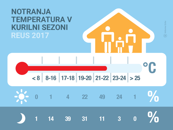 Raziskava REUS 2017, katere glavni sofinancer je podjetje Borzen/Trajnostna energija, predstavlja sedmi val Raziskave energetske učinkovitosti Slovenije, ki jo izvaja Informa Echo v sodelovanju s partnerji od 2009. Tudi zadnja je seveda prinesla niz zanimivih ugotovitev. "Nižje dnevne temperature pod 18 stopinj denimo vzdržujejo predvsem gospodinjstva z majhnim številom članov (do dva) in v Obalno-kraški in Goriški regiji. Višje temperature od 23 stopinj vzdržujejo predvsem gospodinjstva z otroki v Koroški in Pomurski regiji," povzema izsledke Rajko Dolinšek, direktor podjetja Informa Echo in vodja projekta REUS. "Dnevna temperatura nad 23 stopinj je enakomerno razporejena med vsemi družbeno ekonomskimi sloji in ni značilna za gospodinjstva z višjimi dohodki. Visoke dnevne temperature si privošči 24 % gospodinjstev z nižjimi prihodki od 690 evrov, 25 % s prihodki od 691 do 1380 evrov, 21 % s prihodki od 1381 do 2070 evrov, 22 % s prihodki od 2071 do 2760 evrov in 25 % z višjimi prihodki od 2761 evrov. Nočno temperaturo, ki je nižja od 16 stopinj, vzdržujejo gospodinjstva z nižjimi prihodki od 690 evrov, manjša gospodinjstva (do dveh članov), gospodinjstva brez otrok in gospodinjstva v Zasavski regiji. Nočne temperature nad 21 stopinj pa vzdržujejo predvsem gospodinjstva z višjimi prihodki od 2760 evrov, gospodinjstva z mlajšimi člani od 35 let, gospodinjstva z otroki in gospodinjstva v Pomurski regiji," še ugotavlja Dolinšek.