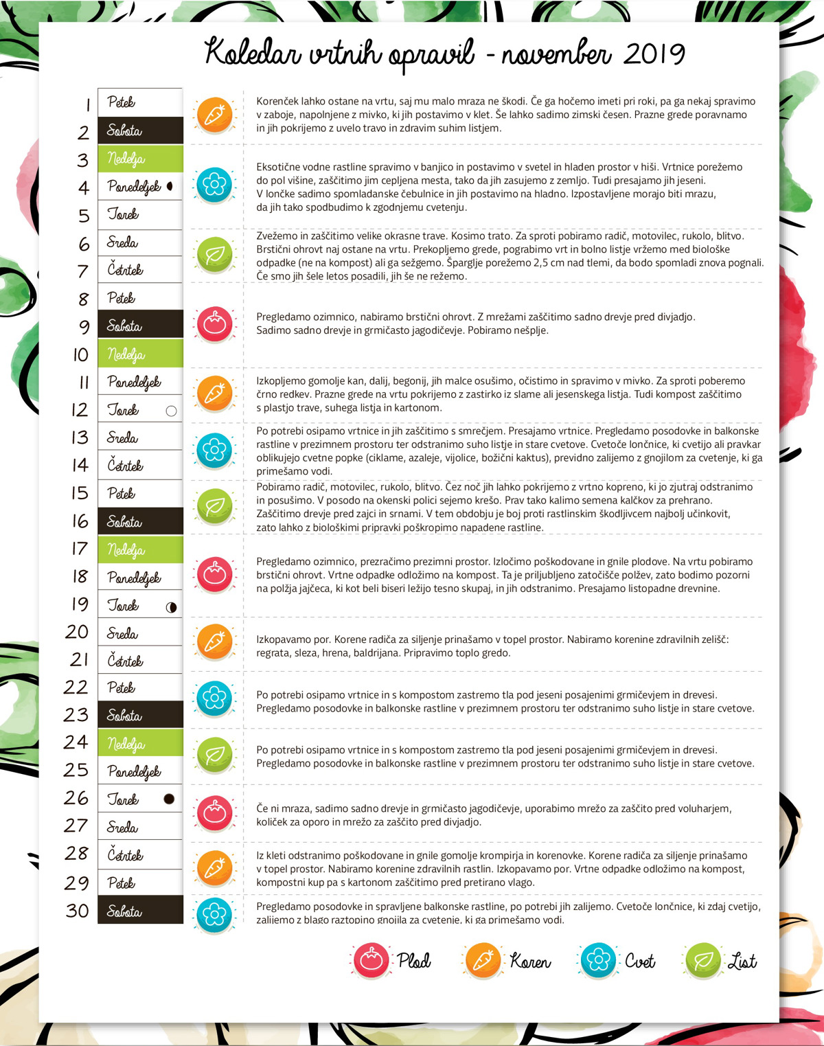 Oktobrski dnevi so bili izjemno topli, a november bo že zahteval, da se odenemo v plašče. Toplota bo pobegnila tudi z zelenjavnih vrtov, s katerih smo nedavno pospravili razhudnike, jedilne buče in sladki krompir. Na gredah dalje ostajajo prezimne sorte pora in motovilec, zimska solata, blitva, listni in brstični ohrovt ter radiči. Najprej poberite štrucarja, do decembra bo ostal rdeči glavnati radič, prezimnega pustite na prostem za rezanje glavic v spomladanskem času. Do 10. novembra je še primeren čas za sajenje česna. Dokler ne zmrzuje, lahko pustite na vrtu tudi endivijo, brokoli in kitajsko zelje. Poletne setve korenčka v juniju so primerne za spravilo v novembru, bo pa korenček prezimil tudi na prostem, če ga zasujete z zemljo ali zaščitite bodisi z listjem bodisi s koprenasto vrtno pokrivalko. V klet shranite zeleno, rdečo peso, do konca novembra pa še glave rdečega, belega in kitajskega zelja ter ohrovta. Špargljeve poganjke, ki so že orumeneli, porežite 2,5 centimetra nad tlemi in stebla sežgite ali vrzite med biološke odpadke.
