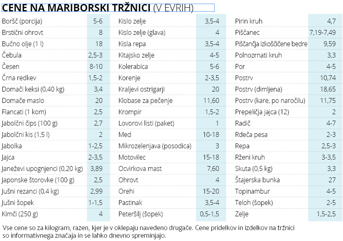 Cene krofov na mariborski tržnici so naslednje: navadni z marelično marmelado 0,89 evra, čokoladni 1,39 evra, berlinski krof: 2,99 evra. "Hitro jih prodamo, ker pridejo kupci in jih vzamejo po deset," pove prodajalka Vesna Čelan za Večer. "Klasični, polnjeni z marelično marmelado, gredo najbolj v slast Mariborčanom in Mariborčankam."