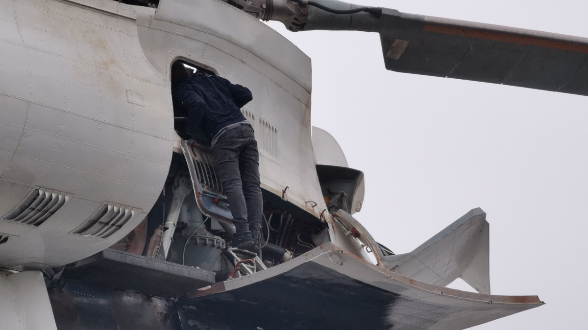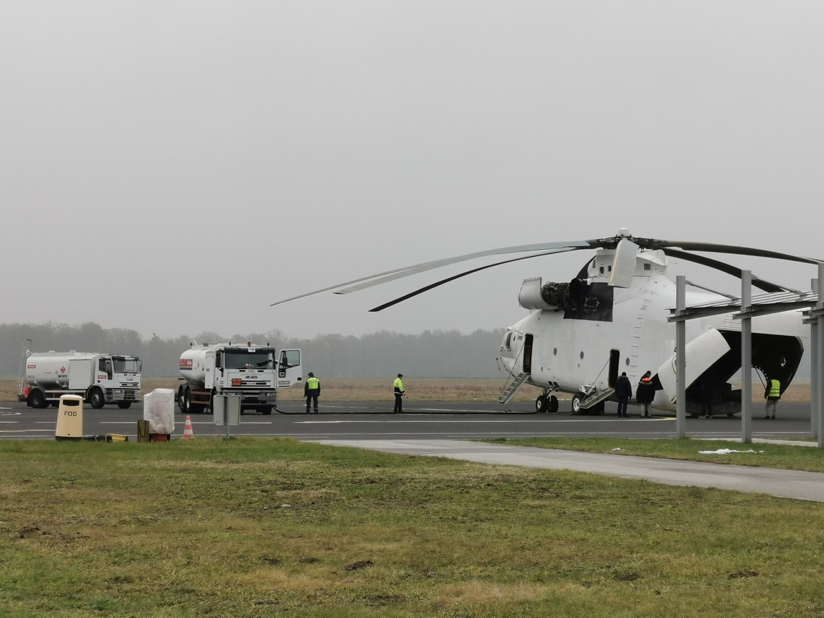 Preden sta se glavni rotor s premerom 32 metrov in repni s premerom 7,6 metra zavrtela, so tehniki podrobno pregledali vsako odprtino helikopterja. Da bi zaščitili vremensko postajo pa se je letališče odločilo, da ga bodo potegnili nekaj deset metrov stran v smeri vzletno/pristajalne steze. Mi-26 je tako naširoko zazijal, odprl vrata tovornega prostora, kjer se poleg štirih rezervoarjev za gorivo s skupno kapaciteto približno 12.000 litrov, ki doseg helikopterja podaljša na 1600 kilometrov, skriva tudi kovinska cev za