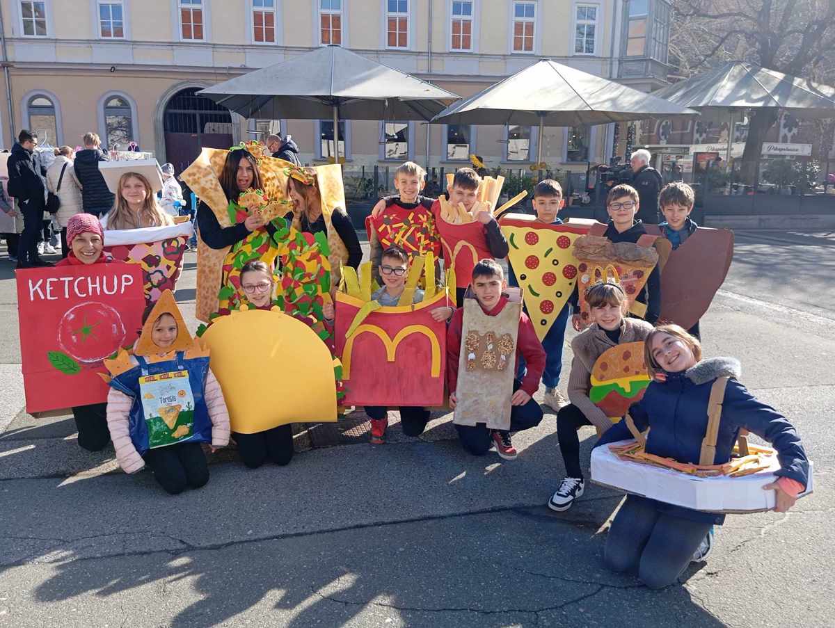 Kot vsako leto so s skupinskimi maskami navdušili tudi učenci in učitelji OŠ Malečnik. Ena skupina je izdelala svetleče srebrne robote, druga pa se je prelevila v predstavnike (nezdrave) prehrane. Učenci 5.a so ustvarili maske pomfrija, tortilj, pic, hamburgerjev, testenin, ocvrtih piščanjih krač ... S svojo izvirnostjo so danes presenetili in navdušili tudi razredničarko, ki se je preoblekla v govoreči kečap. "Štirinajst nas je plus kečap. Vsi otroci so se zelo potrudili. Najprej smo skupaj iskali ideje, jih dorekli in nato začeti ustvarjati. In uspelo nam je!" je ponosno povedala razredničarka Darja Ferk. "Vsak si je masko izdelal sam doma. Uporabili smo različne materiale, papir, karton, testenine, peno ... Vsak je za izdelavo porabil približno dva dneva. Moja mama je bila pravzaprav vesela, da sem porabila nekaj testenin, saj smo jih imeli doma preveč," je v smehu dodala učenka Izabela Murič. Grof Filip in grofica sta na mariborski trg iz francoskega dvorca pripeljala učence iz Osnovne šole Centra za sluh in govor.