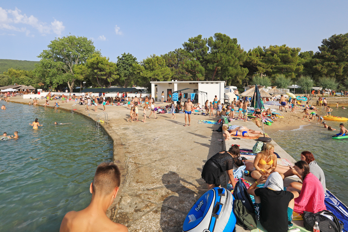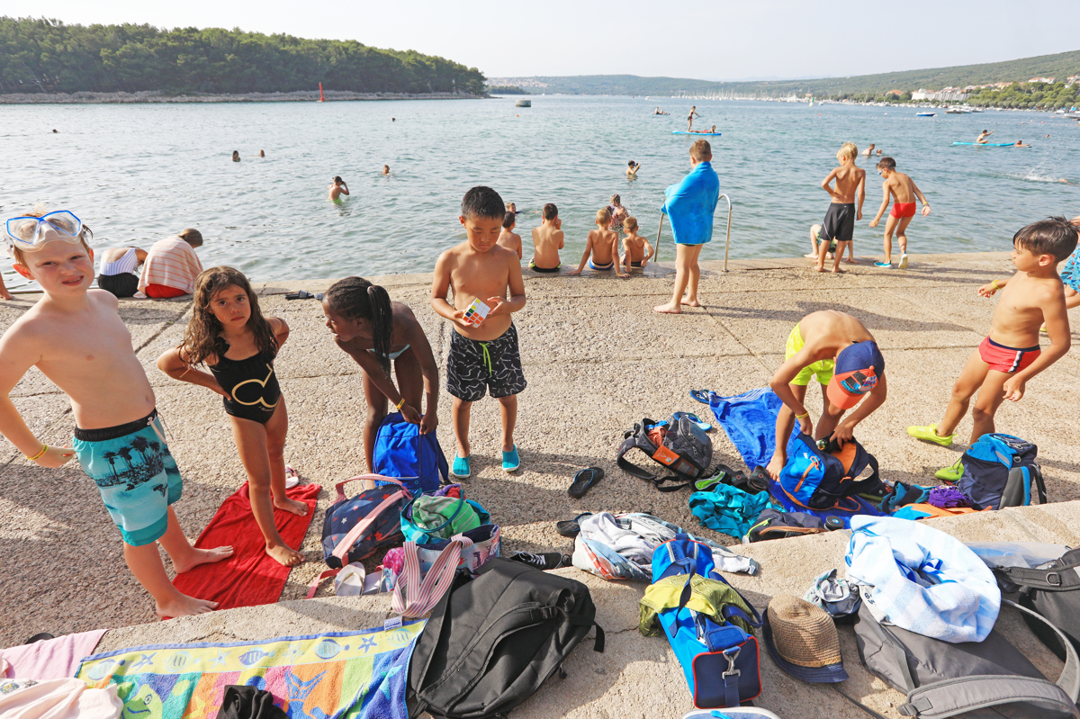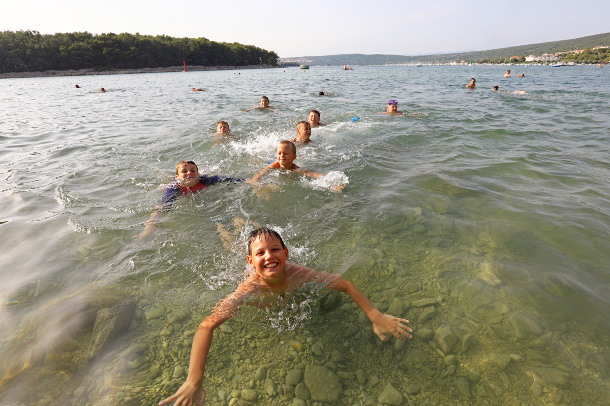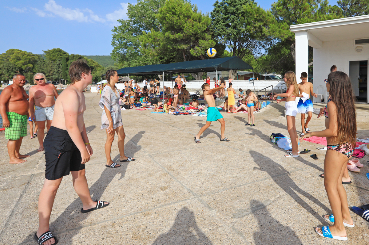Popoldan smo se z otroki odpravili na plažo, ki je rezervirana samo za njih. Imajo tudi lastne prhe, sanitarije in pitnike hladne vode. Mlajši deček Jakob, ki je opravljal vlogo reševalca iz vode, je opozarjal vrstnike, naj ne plavajo predaleč, tudi pisca teh vrstic. Odbojkarji so naju s fotografom spraševali, ali sva srečala Luko Dončića, ki je bil čez vikend v Punatu, a ga nihče ni srečal. Otroke je na plaži nagovoril tudi pedagoški vodja Merc in jih vprašal, ali se imajo fajn. V en glas so odgovorili: "Jaaaaa!"