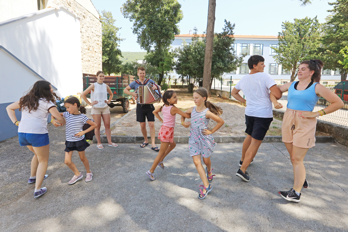 Na velikem rumenem ležalniku opazimo skupino starejših dečkov. Dva sta osredotočena na telefon, ostali se pogovarjajo. Petnajstletni Nik Krle v Punatu letuje že četrto leto. Vrača se zaradi dobrega počutja in prijateljev. "Najpomembnejša sta druženje s prijatelji in morje. Spoznavam tudi nove ljudi," še pojasni Nik, ki je pred kratkim zaključil osnovno šolo. Med pogovorom se slišijo zvoki harmonike, in ko pogledamo bližje, opazimo skupino otrok med učno uro folklore, ki jo vodi učitelj Davorin Horvat.
