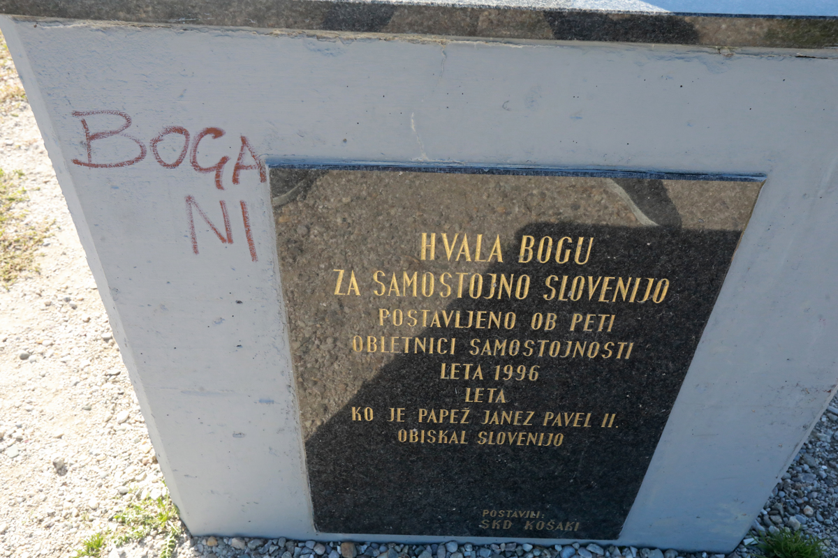 Spomenik samostojni Sloveniji na Stolnem vrhu je bil vnovič tarča vandalov. Spomenik so leta 1996 postavili Slovenski krščanski demokrati na pobudo Alojza Senekoviča, material pa so prispevali posamezniki in podjetja. "To je še vedno edini spomenik samostojni državi v Sloveniji," pravi razočarani in zaskrbljeni Senekovič. Vandali na podstavek križa, ki nosi napis Hvala bogu za samostojno Slovenijo, vedno znova zapisujejo nestrpna sporočila.