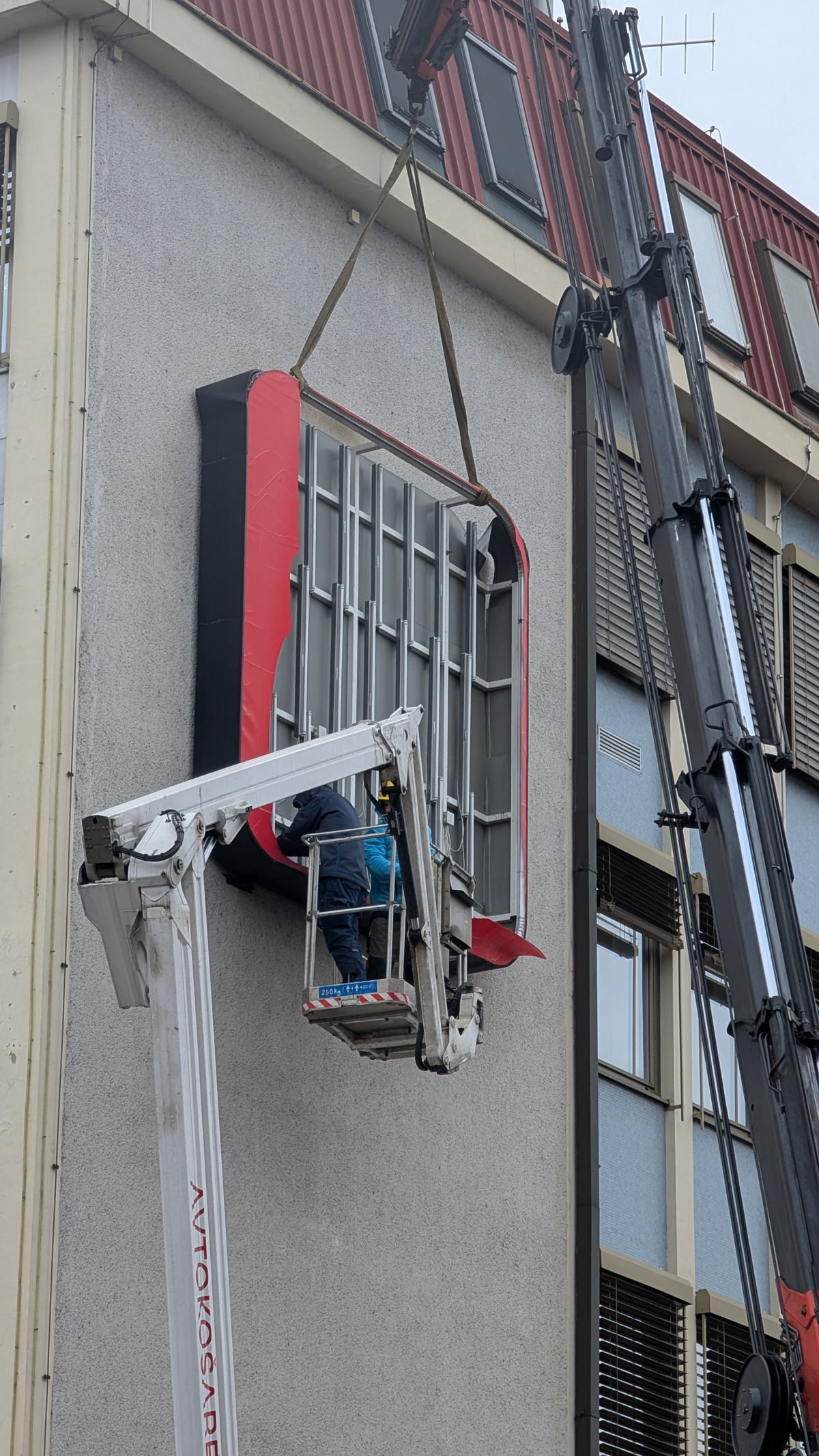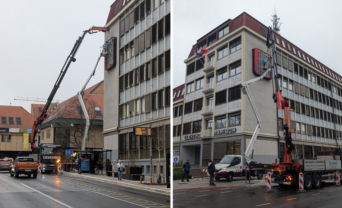 Od daleč je bilo videti, kot da je logotip Elektra Maribor, ki se nahaja na poslovni stavbi mariborskega podjetja za distribucijo električne energije na Vetrinjski ulica 2, poškodoval močan veter, ki smo mu bili v Mariboru in okolici priča minulo noč. Delavec, ki se je zjutraj z avtokošaro dvignil več kot 10 metrov visoko, je ravno pritrjeval jeklene vrvi na ogrodje osvetljenega logotipa, ki so ga kot kaže nameravali odstraniti s fasade.