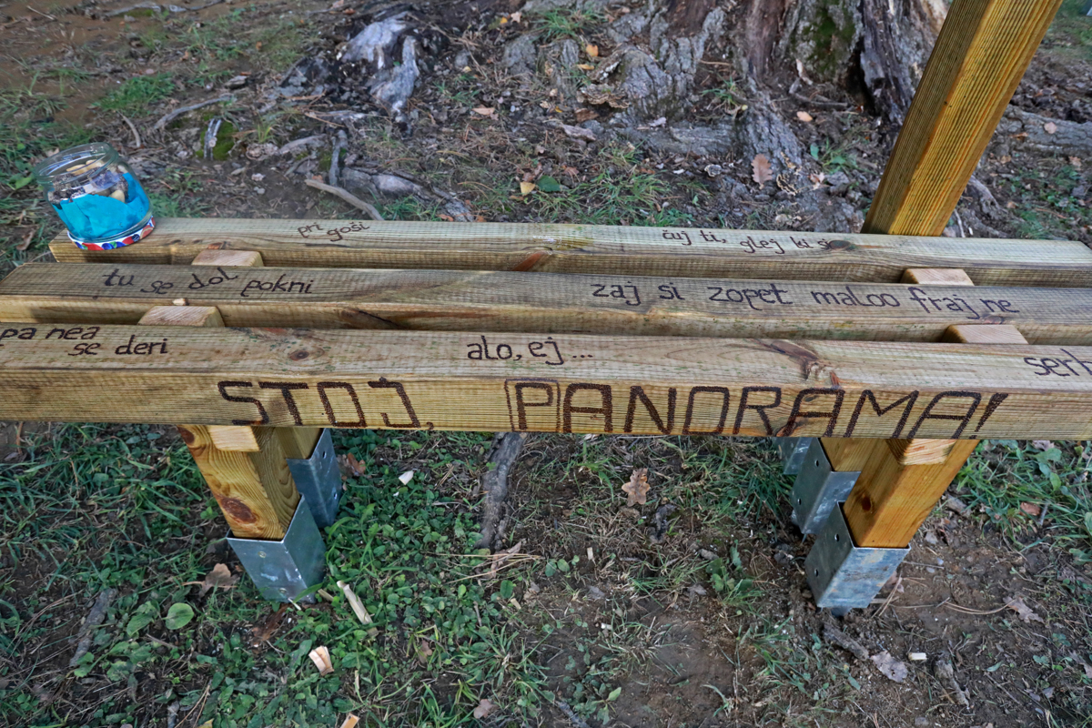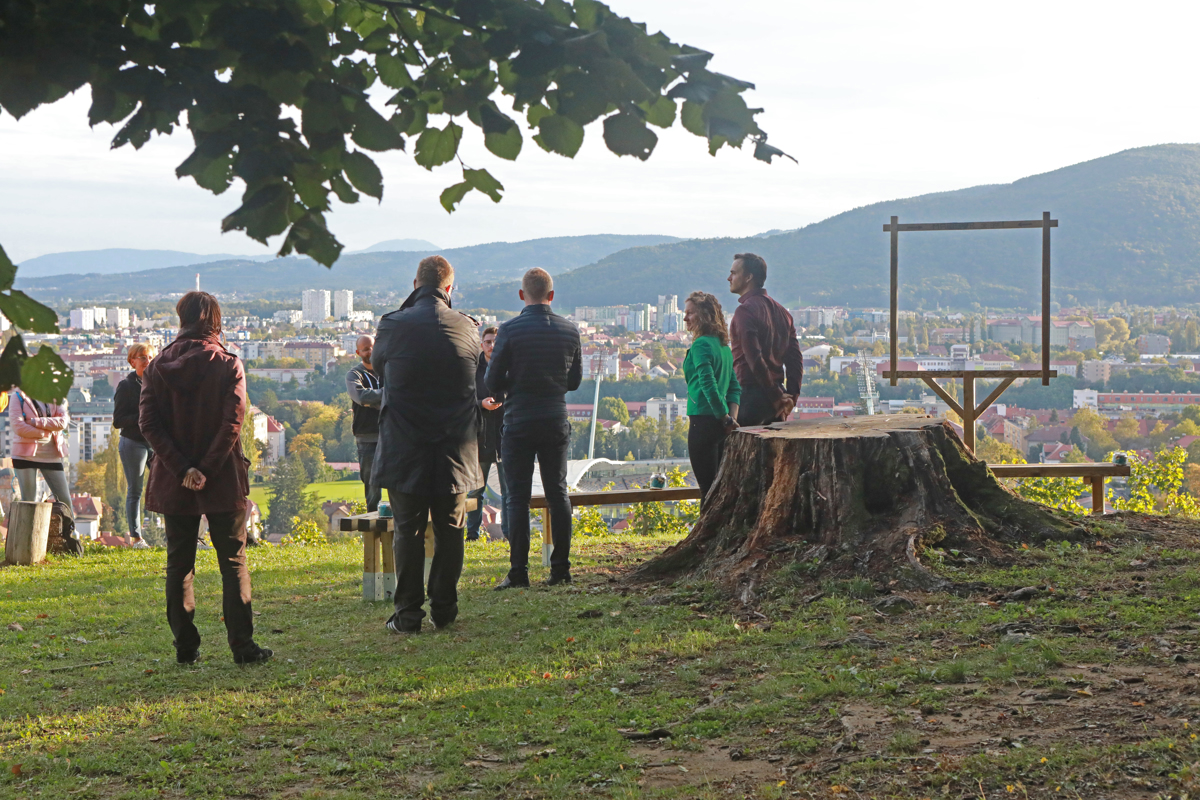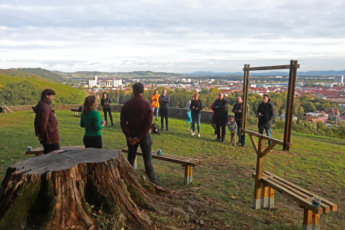 Že obstoječim klopem so zdaj dodali še tri lesene klopi, postavljene okoli štora rdečega hrasta, posekanega po žledolomu leta 2014, popisane so z značilnimi mariborskimi stavki. "Da bodo Mariborčani lahko posedeli, se umirili, se razgledali nad mestom. Za turiste pa je ta okvir za selfije," je dejala Eva Žunec. Projekt je izpeljala skupaj s prijatelji Majo Šnuderl, April Veselko in Alenom Prepeličem.