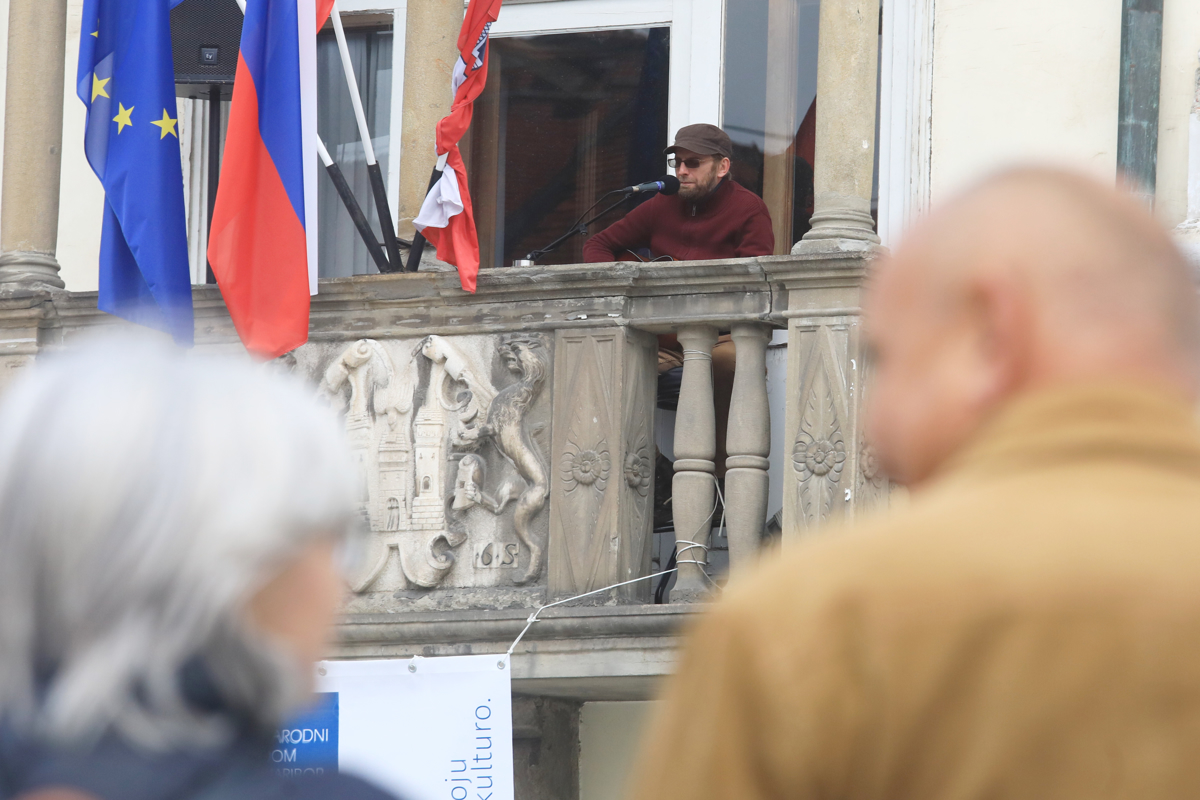 Pod balkonom mestne hiše na Glavnem trgu in pod grajskimi arkadami je bila zastava z napisom "Narodni dom v boju za kulturo" in logotipom s stisnjeno pestjo. Na balkonu je bil kantavtor Tadej Vesenjak, v grajskem zunanjem hodniku pa trobilni Trobilni kvintet BBS. Tretji oder je bil mobilni, Jurček je prevažal bobnarje Plesne izbe. Ko se je Tadej Vesenjak po pol ure ravno poslovil in se je primerno distancirano poslušalstvo na Glavnem trgu začelo razhajati, se je zaslišal odmev bobnov s promenade na Lentu.