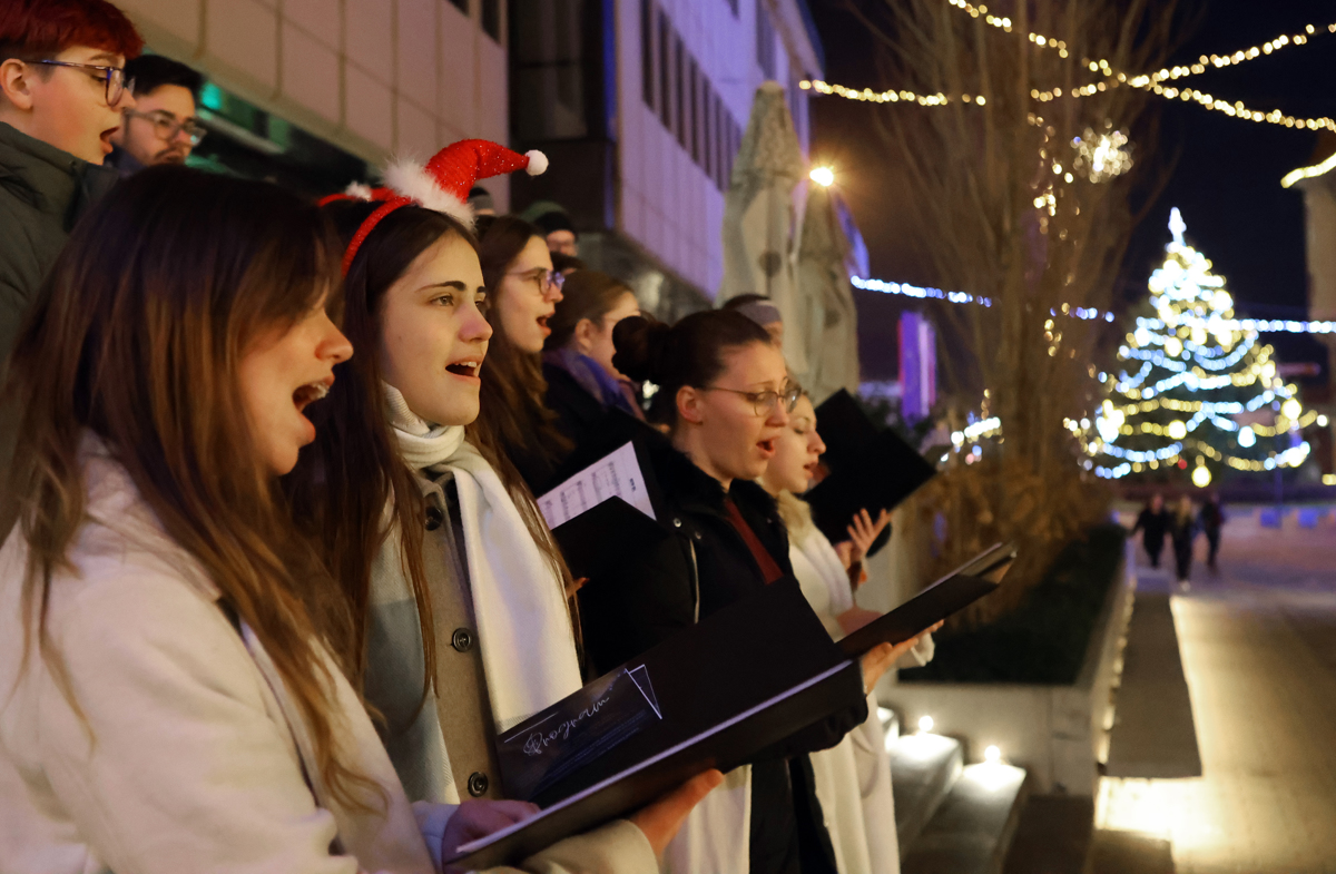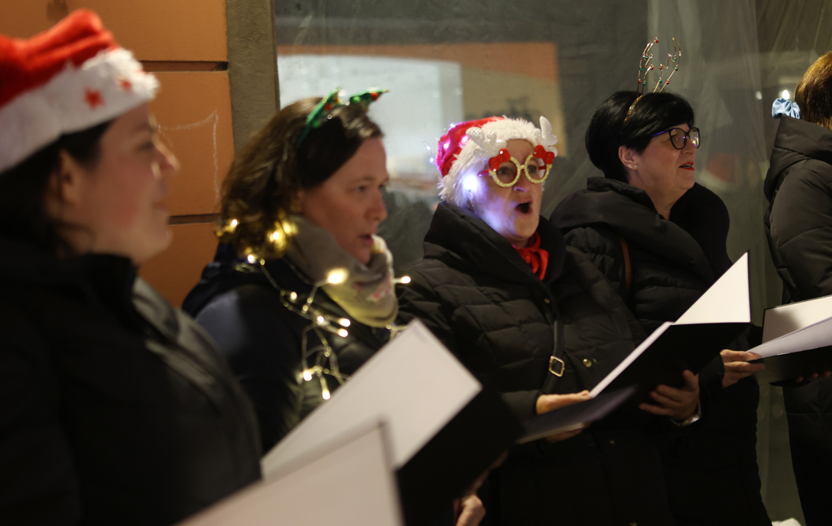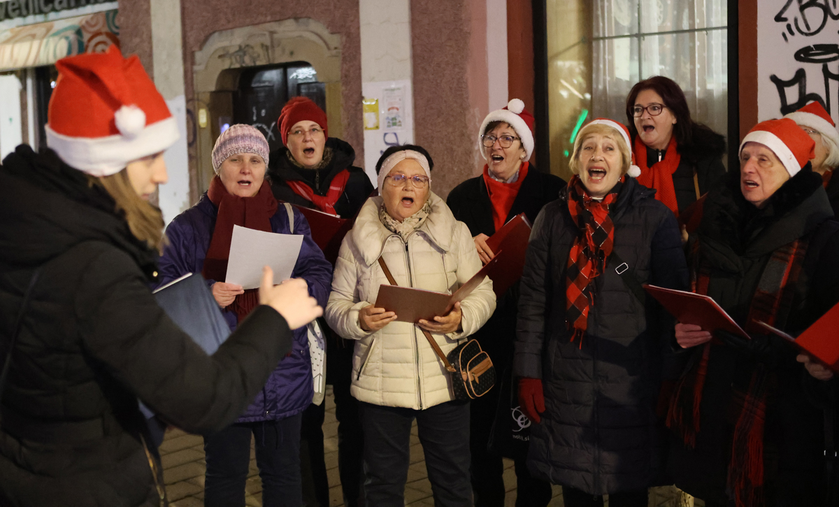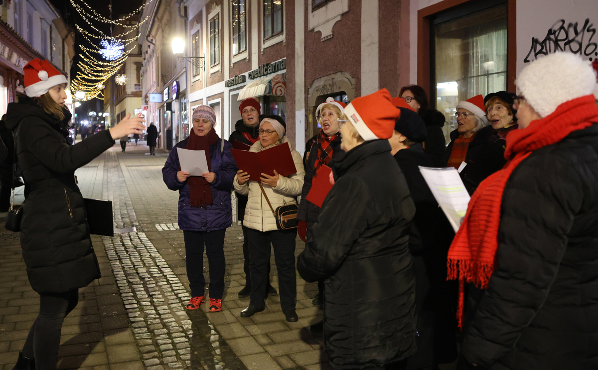 Ženski pevski zbor Nove KBM je odpel Tihi večer, Angeli živijo, O Holy Night ... "Petje sprosti, zbliža, ozdravi dušo in za trenutek tudi fizično bolečino odmisliš," je dejala zborovodkinja Žana Gajer. Vse od začetka koledovanja po mariborskih ulicah popestrijo utrip Maribora pevke Vokalne skupine Allegro, skupnost vrtcev Maribor pod vodstvom Matije Varla. "To je nekaj našega, naša pristnost, da se znamo ob svoji glasbi ustaviti, umiriti, potopiti vase in za trenutek ali dva ustaviti korak, kar ljudje ob našem petju storijo in nam je v veliko veselje. V tem uživamo, nam je prijetno, da prinesemo malo prazničnega utripa v mesto," je dodala Jožica Šošter. Slišali smo tudi pesem Prišla je lepa, sveta noč Gustava Ipavca.