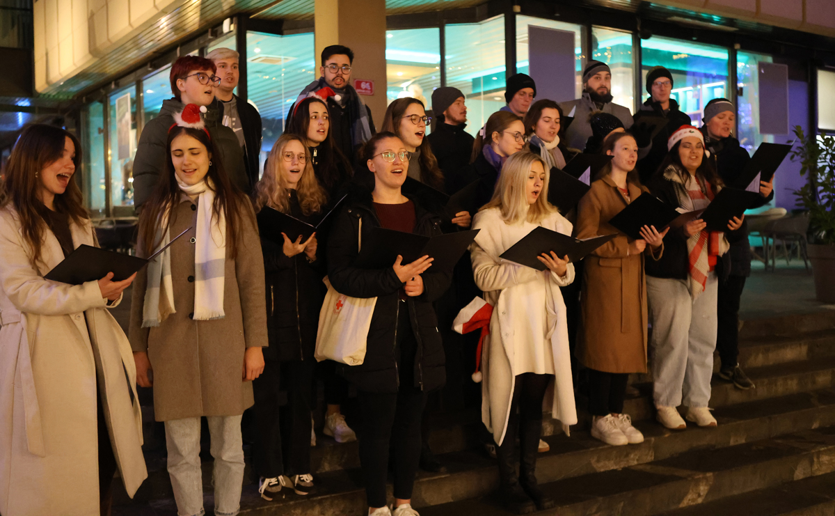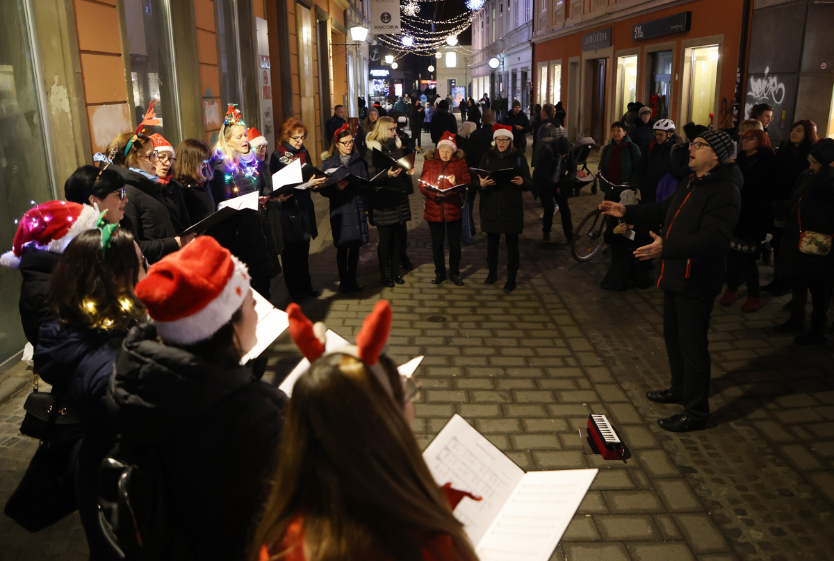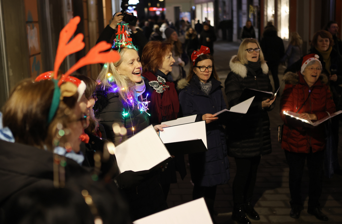 Ženski pevski zbor Nove KBM je odpel Tihi večer, Angeli živijo, O Holy Night ... "Petje sprosti, zbliža, ozdravi dušo in za trenutek tudi fizično bolečino odmisliš," je dejala zborovodkinja Žana Gajer. Vse od začetka koledovanja po mariborskih ulicah popestrijo utrip Maribora pevke Vokalne skupine Allegro, skupnost vrtcev Maribor pod vodstvom Matije Varla. "To je nekaj našega, naša pristnost, da se znamo ob svoji glasbi ustaviti, umiriti, potopiti vase in za trenutek ali dva ustaviti korak, kar ljudje ob našem petju storijo in nam je v veliko veselje. V tem uživamo, nam je prijetno, da prinesemo malo prazničnega utripa v mesto," je dodala Jožica Šošter. Slišali smo tudi pesem Prišla je lepa, sveta noč Gustava Ipavca.