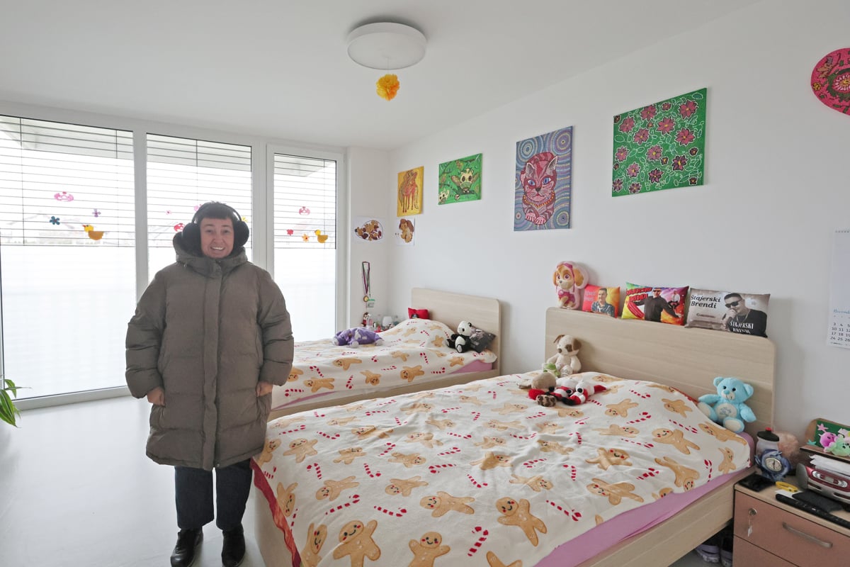 Stanovalci, stari so od 40 do 72 let, so se v nove prostore preselili januarja 2024, potem ko so prej živeli v prostorih na Pobrežju, kjer je bivalo sedem uporabnikov. Novi dom jim omogoča popolnoma prilagojene pritlične prostore – od klančin in dostopnih hodnikov brez pragov do individualnih sob, ki zagotavljajo več zasebnosti. Sedem stanovalcev ima svojo sobo, štiri dekleta pa si – po lastni želji – še naprej delijo dve dvoposteljni sobi. Imajo tudi skupno kuhinjo in jedilnico in velik skupni prostor, kjer se lahko družijo. Stanovalci ali njihovi starši so dovolili, da vstopimo in so ogledamo njihov dom.