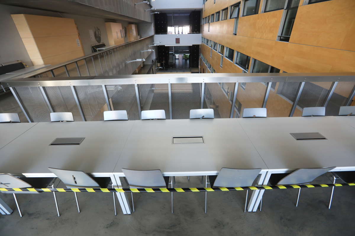 Tudi fakultete so že tretji mesec zaprte. Predavalnice so prazne, vsak korak ali beseda odmeva po hodnikih, v laboratorijih se večinoma nabira prah. Nekaj dogajanja je le v posameznih kabinetih, kajti visokošolski učitelji in raziskovalci vendarle lahko pridejo na delovno mesto, četudi jih mnogo predavanja na daljavo in druge obveznosti opravi kar od doma.