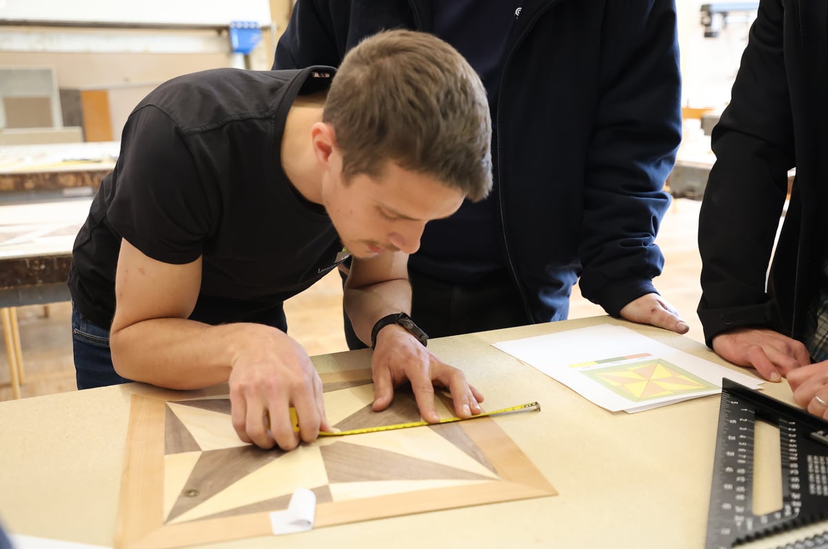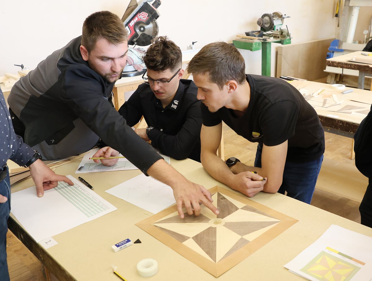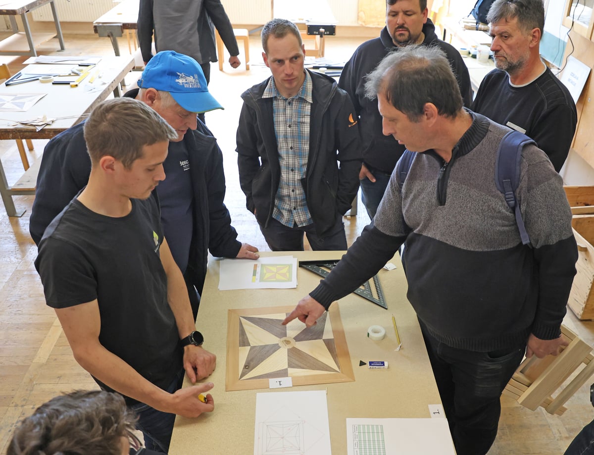 Nič manj zahtevna ni bila izdelava intarzije, dekorativnega vzorca iz furnirja, kjer so dijaki v omejenem času ustvarjali natančne geometrijske oblike iz različnih vrst lesa. Izdelali so štirikotno zvezdo z okvirjem, kjer je bila vsaka napaka merljiva v milimetrih in kaznovana z odbitkom točk.