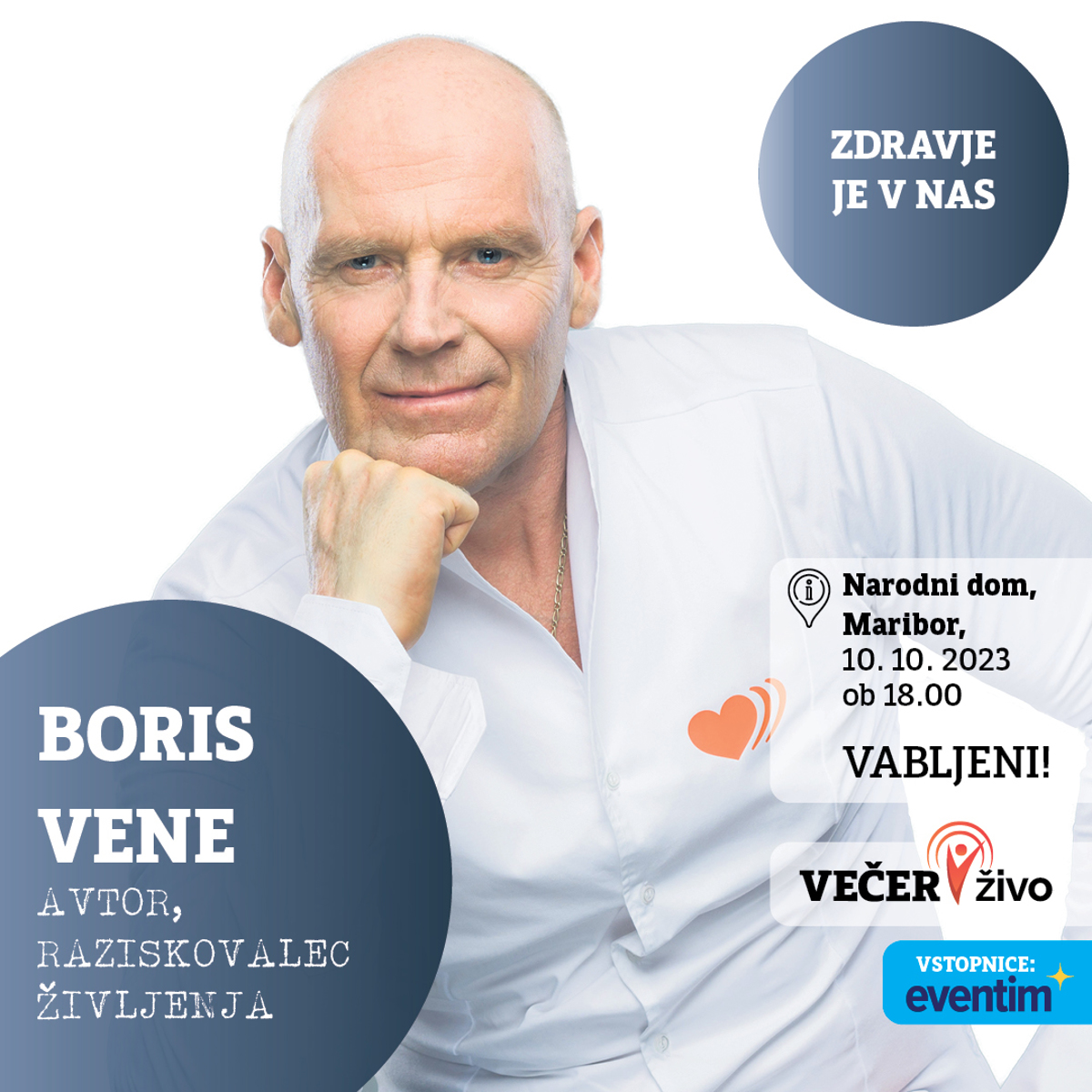 - Večer v živo: Boris Vene o samoozdravitvi, zakaj zbolimo, katere so skrivnosti izpopolnjenega življenja. Narodni dom ob 18. uri.
