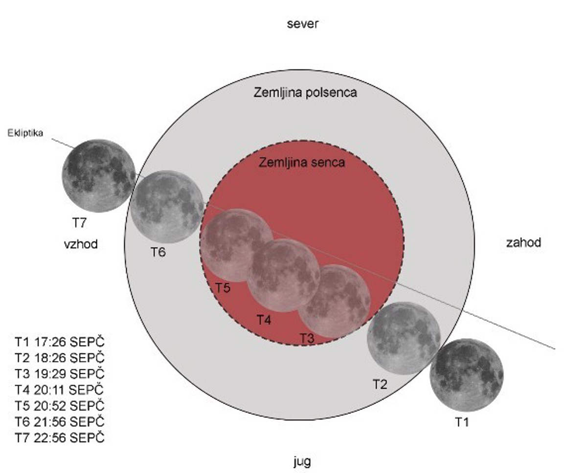 Kot smo dejali, se ob luninem mrku Luna znajde v Zemljini senci. Ker Sonce ni točkasto svetilo, ampak oddaja svetlobo s ploskve navideznega premera okoli pol ločne stopinje, se za Zemljo pojavljata polsenca in senca. Ko Luna zaide v Zemljino polsenco, s prostim očesom tega ne moremo zaznati. Tak mrk imenujemo polsenčni lunin mrk. Naslednja možnost je, da Luna na svoji poti le deloma zaide v Zemljino senco, tedaj nastopi delni lunin mrk. Ko se vsa Luna znajde v Zemljini senci, imamo popolni lunin mrk. Ta pojav bomo lahko opazovali tudi v naših krajih v nedeljo, 7. septembra, v večernem času. Luna bo v Zemljino senco začela prehajati ob 18.26 po srednjeevropskem poletnem času, a te faze še ne bomo mogli opazovati, saj bo v Mariboru Luna nad matematično obzorje vzšla šele ob 19.21, nad dejanskim obzorjem pa - odvisno od ovir na obzorju - še kasneje. Najbolj zanimiva faza – začetek popolnega luninega mrka – se bo začela ob 19.29, ko bo Luna le stopinjo nad obzorjem. Vrhunec popolne faze bo ob 20.11, medtem ko bo Luna ob 20.52 začela izstopati iz Zemljine sence v polsenco. Delni lunin mrk se bo končal ob 21.56, ko se bo vsa Luna ponovno znašla v Zemljini polsenci. Popolni lunin mrk bo pri nas v večini še v večernem mraku, saj bo tega dne Sonce za matematično obzorje v Mariboru zašlo ob 19.25, medtem ko se bo prava noč začela ob 21.11. Morda še koristen podatek za tiste, ki bodo že vnaprej določili lokacijo, s katere bodo opazovali mrk: azimut vzhodišča Lune bo okoli 99°, torej približno v smeri vzhod. V času maksimuma mrka bo višina Lune 7°, njen azimut pa 108°.