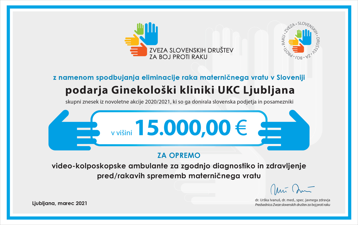 Zveza slovenskih društev za boj proti raku je podarila ginekološki kliniki UKC Ljubljana 15.000 evrov za opremo za zgodnjo diagnostiko in zdravljenje predrakavih sprememb materničnega vratu.