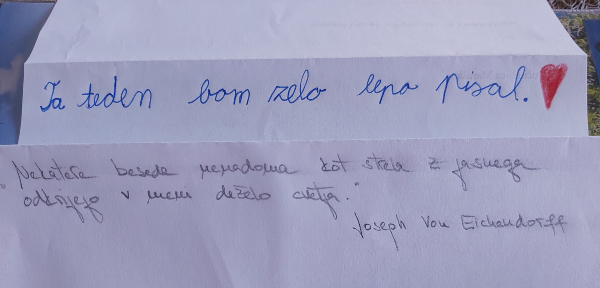 Vodja projekta Klara Napast je za učence pripravila uganke Ali poznaš pisavo svojih učiteljev. Fotografije rokopisov so med tednom objavljene na facebooku šolske knjižnice in na internih virtualnih oglasnih deskah. Učenci od prvega do petega razreda v tem tednu pišejo, kar se dogovorijo z učitelji. Učenci osmih in devetih razredov bodo izbrali poljubno Prešernovo pesem in se poskusili v lepopisju, učenci šestega in sedmega razreda pa bodo spisali sporočilo prijatelju ali sorodniku, ki ga zaradi razmer niso videli že nekaj časa.