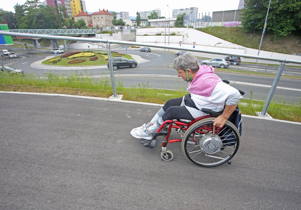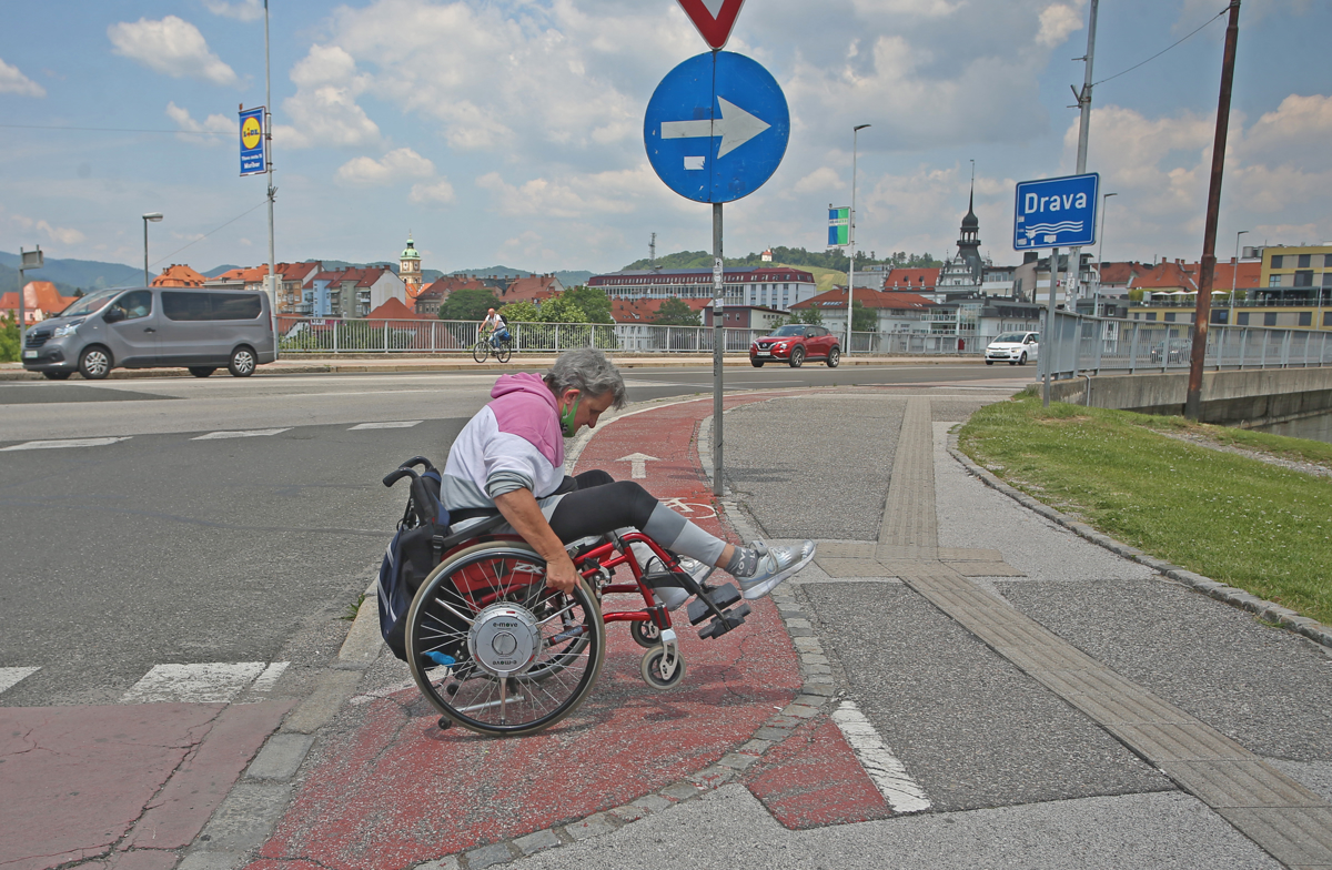 "Glej, kako je to šlampasto narejeno! Če nisem pozorna in 'padem' tu notri, mi lahko utrga kolo," pravi Štefka Vegan, Mariborčanka, ki se na invalidskem vozičku redno udeležuje tekov, na začetku našega kratkega obhoda, na katerega nas je povabila, da bi nam pokazala, kako (ne)dostopen je Maribor. Njene pripomba je veljala rdečim kockam, ki na Titovem mostu označujejo kolesarsko stezo. "Kar odpadajo!" Drži - vsake toliko katera manjka. Pomislim, da tega doslej, ko sem čez most pešačila, nisem zaznala. Kot tudi ne lukenj in vdolbin v asfaltu, na katere opozarja mimogrede. Vsemu se Štefka spretno izogne, nato pa se ustavi pred klančino na koncu mostu.