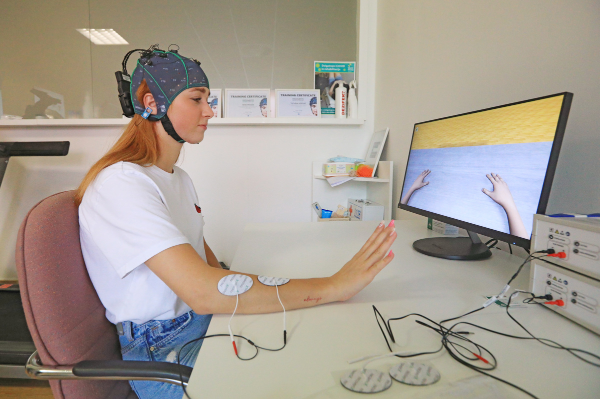 Ko pride v prostore Zavoda Terapija v stavbi Alme Mater, ji dajo na glavo kapo z elektrodami. Prej na kapo namažejo gel, ki služi kot prenašalec. Na roko nastavijo druge elektrode, tako imenovani FES ali funkcionalno električno stimulacijo. Pred njo se na zaslonu pokaže avatar, preko katerega prejema povratno informacijo o tem, ali si pravilno zamišlja gibe roke. Če ji to uspe, se preko električne stimulacije premakne njena roka, gib pa v celoti vidi tudi na ekranu.