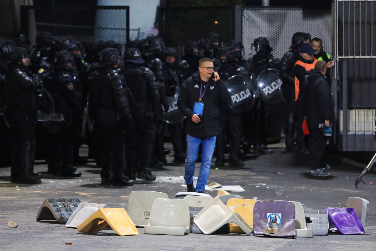 Navijaški skupini, viole so bile nastanjene ob robu južne tribune, sta skrbeli za glasno podporo, nato pa smo bili v Ljudskem vrtu priča nemilim scenam na severni strani igrišča. Ob zaključku prvega polčasa je zaradi početja green dragonsov sodnik prekinil obračun. S severne tribune so proti Roku Kronavetru, nekdanjemu igralcu zeleno-belih, metali kozarce, vžigalnike in stole. V nadaljevanju tekme so nekajkrat proti zahodni tribuni vrgli goreče bakle. Da bi to početje prenehali, so Ljubljančane pozivali tudi njihovi ljubljenci in trener Robert Prosinečki. Nerede so Ljubljančani nadaljevali tudi v drugem polčasu, ko so proti zahodni tribuni zmetali večje število bakel, ter po zadnjem sodnikovem žvižgu. Zaradi lomljenja ograje in uničevanja stadiona, iztrganih naj bi bilo 52 sedežev, so pred tribuno po koncu tekme stopili policisti in uporabili solzivec. Tu se zgodba ni končala - med praznjenjem severne tribune je eden od obiskovalcev tekme med uniformirance odvrgel kar ograjo ter zadel policista posebne enote. Slednjemu so ob zelenici nekaj minut pomagali člani nujne medicinske pomoči, ponesrečenca pa so s stadiona v UKC Maribor odpeljali z reševalnim vozilom. Osumljenca kaznivega dejanja, ki je napadel policista, so pridržali.