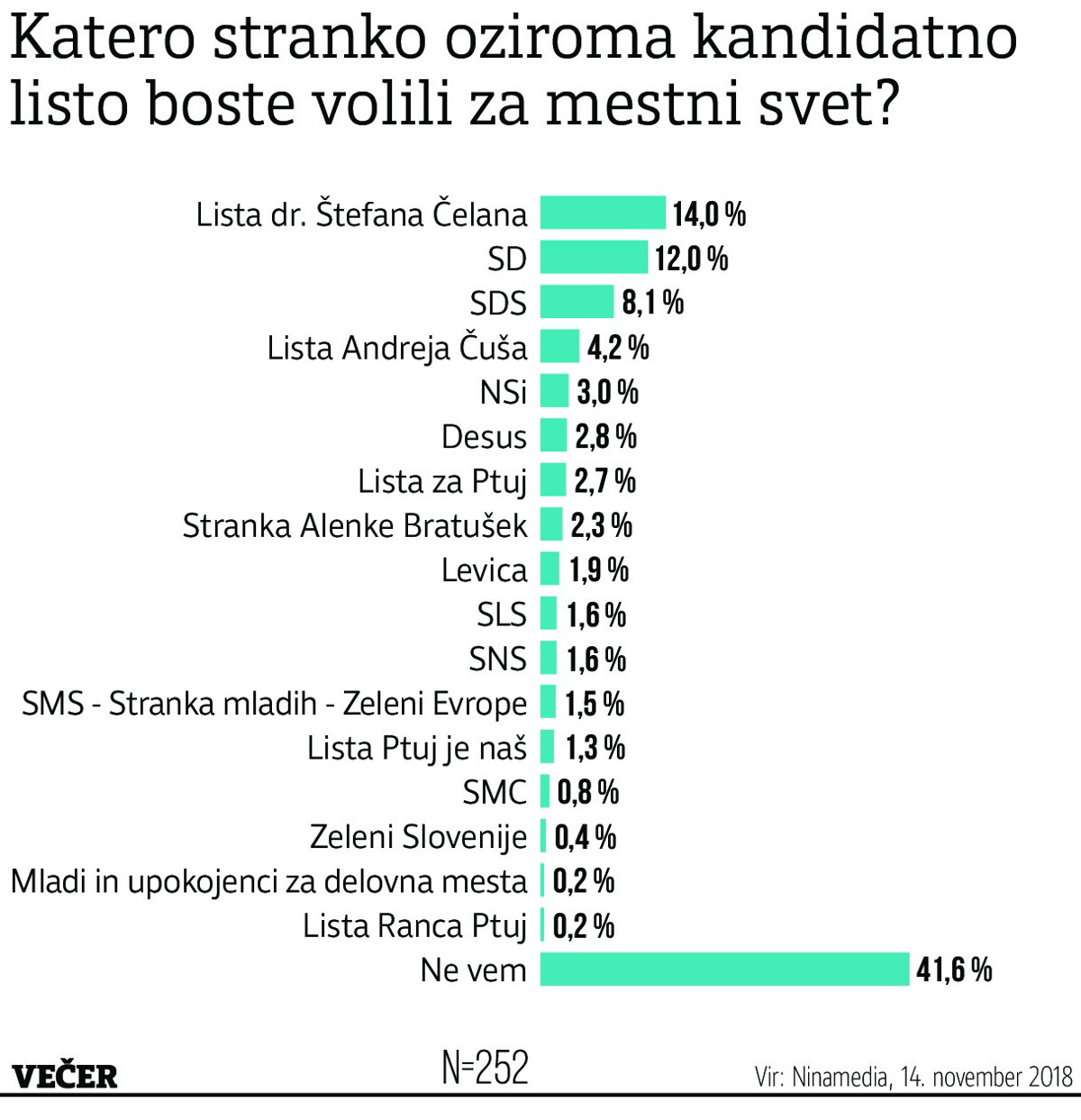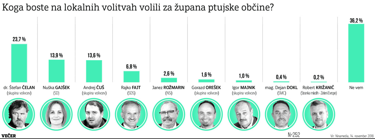 Le štiri dni pred lokalnimi volitvami so ptujski volivci, vključeni v anketo, med deveterico kandidatov namenili največ glasov, 23,7 odstotka, nekdanjemu županu Štefanu Čelanu, ki na volitvah nastopa s svojo listo, občino pa je v preteklosti vodil že dvanajst let, vse do volitev leta 2014. Na drugem mestu s 13,9 odstotka glasov sledi kandidatka SD Nuška Gajšek, ki jo podpira tudi SAB, tik za njo pa je s 13,6 odstotki Andrej Čuš, sicer neodvisni kandidat Liste Andreja Čuša, ki pa so ga podprle tudi parlamentarna stranka SNS, Zeleni Slovenije, katerih predsednik je sam, ter lista Mladi in upokojenci za delovna mesta. Na četrto mesto se je s precej manjšo podporo, 6,8 odstotka glasov, uvrstil kandidat SDS Rajko Fajt. Sledita mu kandidat NSi Janez Rožmarin, za katerega se je opredelilo 2,6 odstotka anketiranih. Preostali ostajajo pod dvema odstotkoma. Sedanjemu podžupanu Gorazdu Orešku, kandidatu Liste za Ptuj, so anketiranci namenili 1,6 odstotka glasov. Za Igorja Majnika, kandidata Liste Ptuj je naš, je glasoval odstotek anketiranih. Na predzadnje mesto se je z 0,4 odstotka glasov uvrstil kandidat SMC Dejan Dokl ter na zadnje z 0,2 odstotka kandidat Stranke mladih - Zelenih Evrope Robert Križanič.