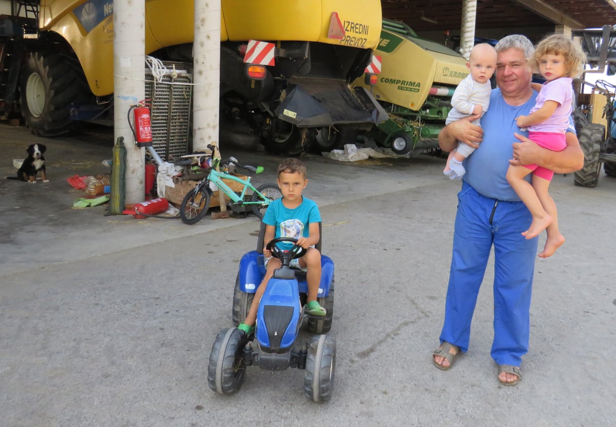 "V vseh letih kmetovanja, z bratom sva po očetovi smrti in materini bolezni leta 1978 prevzela vsa dela na kmetiji, smo vlagali tudi v strojno opremo. Pred leti smo tako registrirali dopolnilno dejavnost, opravljamo strojne storitve, kot so oranje, košnja oziroma baliranje, setev in žetev tako žit kot koruze. Prav te dni je žetev na vrhuncu in s sinom sva le malo doma, pa še najini ženski nama pomagata, saj je premik ogromnega kombajna treba opraviti, kot to zahtevajo predpisi, torej s spremstvom. Danes je naneslo tako, da je s kombajnom na poljih Tadej, spremlja ga Jožica, sam se odpravljam v hlev, Karina ima polne roke dela s tremi otroki, ki odraščajo na kmetiji in smo vsi veseli, ker "ta velika", petletni Jakob in še ne triletna Julija, rada gresta z nami v hlev, tudi na polje ju vzamemo, tako kot polletnega Filipa. Kar je treba, naredimo skupaj, zdaj, ko so z nami otroci, se mi zdi, da je delo lažje. Morda zato, ker je tako fajn otrokom razlagati, kako se prideluje hrana in se skupaj odpraviti na polje, ki seže tja proti gričevnatemu Kicarju."