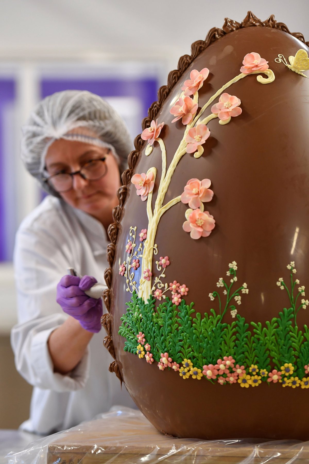 V slaščičarni Cadbury World v Birminghamu so se pred veliko nočjo lotili velikega podviga. In to dobesedno. Ročno so mojstri oblikovanja slaščic izdelali in okrasili 45 kg težko čokoladno jajce, vodja projekta pa je bila Gail Deeley.