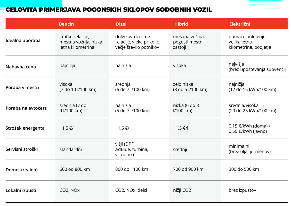 Preden se odločite, kateri pogon bo gnal vaše naslednje vozilo, si postavite ključno vprašanje: »Kje bom preživel 70 % svojega časa za volanom?« Če je odgovor v mestnih zastojih, izberite električno vozilo ali vozilo s hibridnim pogonom. Prihranek pri gorivu in udobje samodejnega menjalnika bosta hitro odtehtala nekoliko višjo ceno, EV pa temu doda še izjemno vozno dinamiko (takojšen visok navor) in izjemno nizko ceno energenta, ki strošek vožnje v primerjavi z drugimi pogoni v praksi vsaj prepolovi.