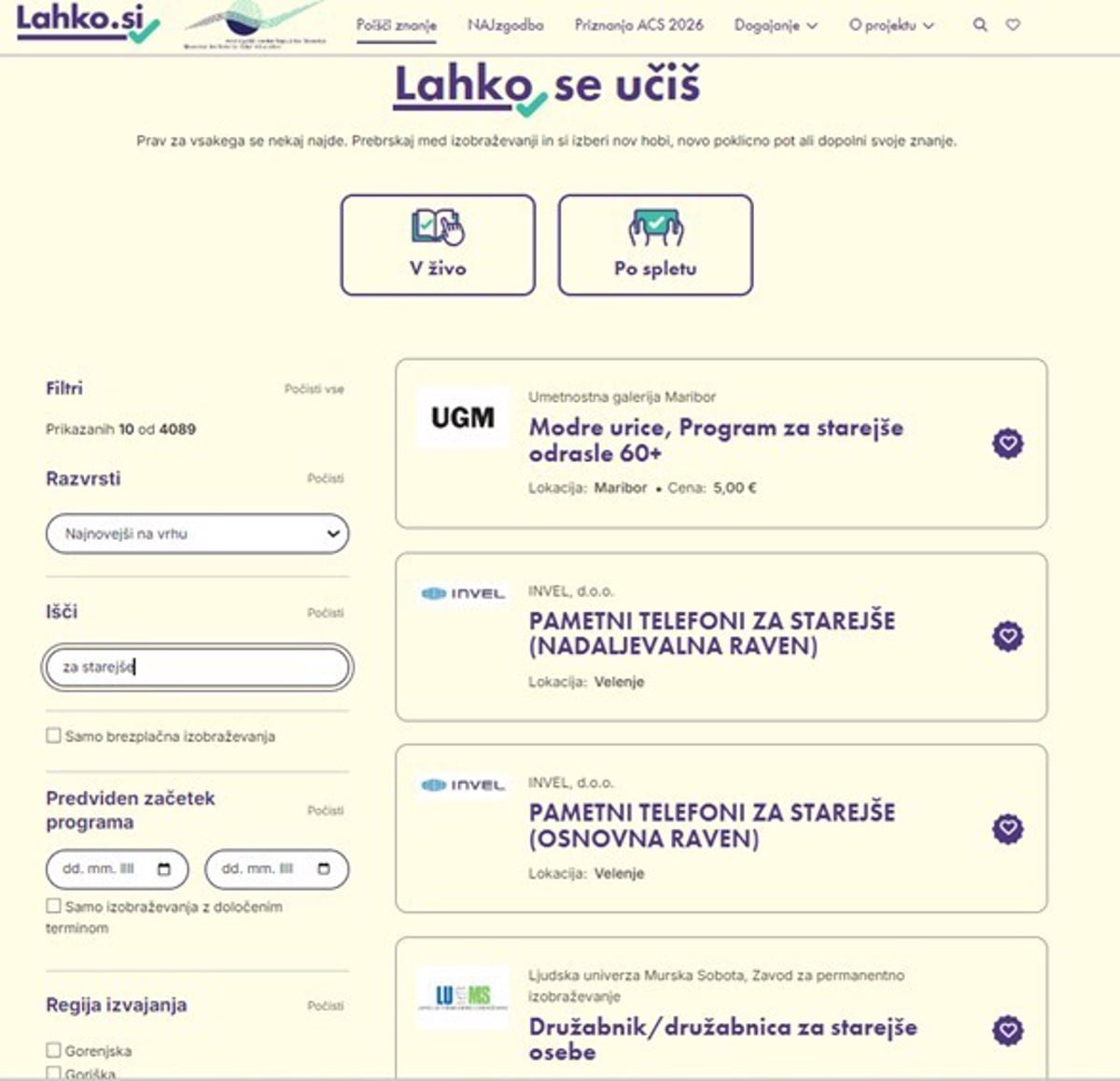 Na Lahko.si lahko starejši na enem mestu najdejo številne tečaje in programe za aktivno, radovedno in povezano življenje – od digitalnih veščin (uporaba pametnega telefona, e-pošte in spletnih storitvev) in jezikovnih tečajev do ustvarjalnih delavnic, gibanja in skrbi za dobro počutje.