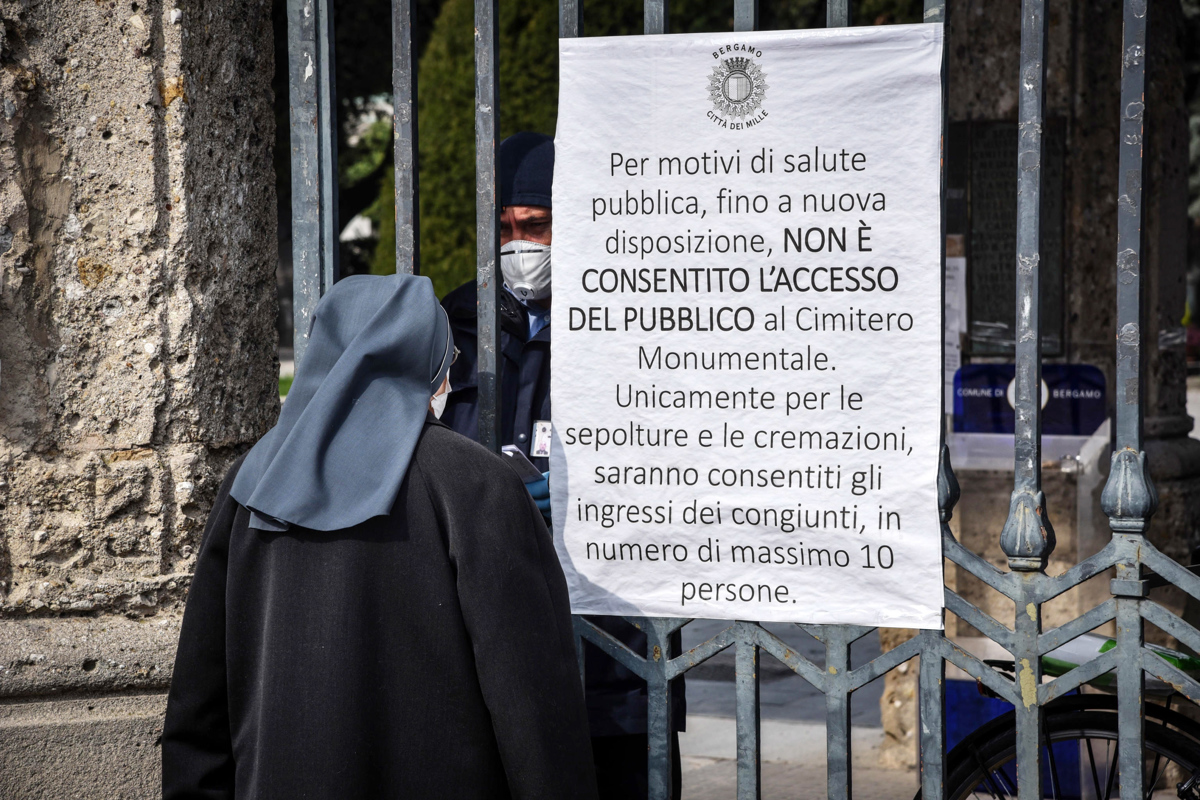 Don Pietro Biaggi vodi župnijo Sant'Alessandro della Croce prav v središču mesta, streljaj od starega jedra imenovanega Città Alta (na sliki). Njegovi duhovniški dnevi niso v teh časih nič drugačni od dni večine drugih Bergamaskov: že dva tedna je zaprt v stanovanju in vztraja v karanteni. Ven stopi samo zaradi najnujnejšega. Cerkev, za katero je odgovoren, je sicer čez dan odprta, vendar v njej seveda ni maš, spovedi, skupnih molitev. Kljub mnogim mrtvim zaradi koronavirusa ne opravlja blagoslovov trupel in pogrebov. Na mestnem pokopališču dežura en duhovnik, ki blagoslovi vsako krsto, ki tja pride, ne glede na to, iz katere župnije je. Pogreba kot pogreba ni. Bergamaški škof je ob tem izjavil, da nihče od zdaj umrlih ne bo ostal brez naknadnega pogrebnega obreda.