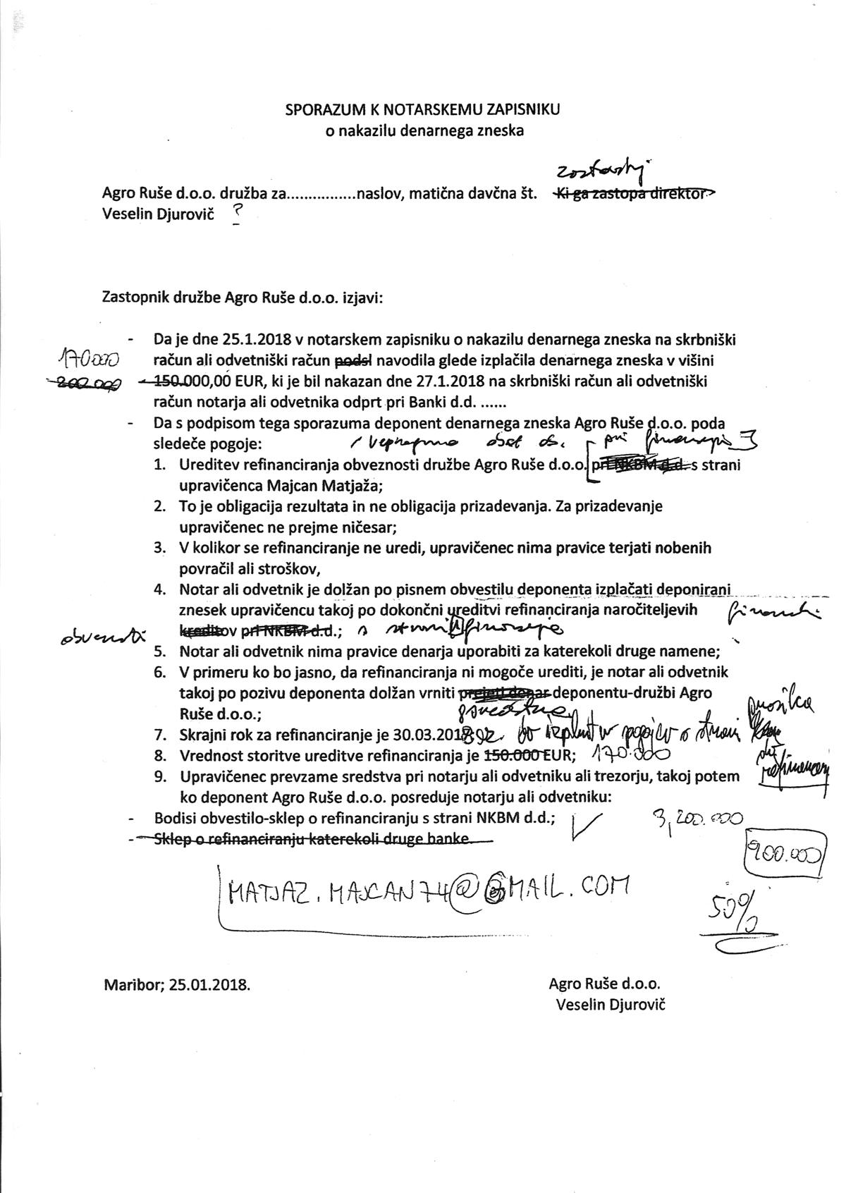 Z njim se je srečal v pasaži mariborskega centra City, kjer se je ponovila zgodba o tem, da se lahko vse težave hitro rešijo in da ga drugače čaka le še stečaj. Sogovornik ga je seznanil tudi s tem, da za večletnimi težavami družbe Agroruše stoji prav ta skupina ljudi. Zahteval je 170 tisoč evrov v gotovini. Na Djurovičevo vprašanje, kako naj pride do tega denarja, je dejal, da ga ne zanima - naj si sposodi, naj hčere vzamejo kredit ali pa naj mu denar posodi njegov nekdanji sošolec, črnogorski predsednik Milo Đukanović.