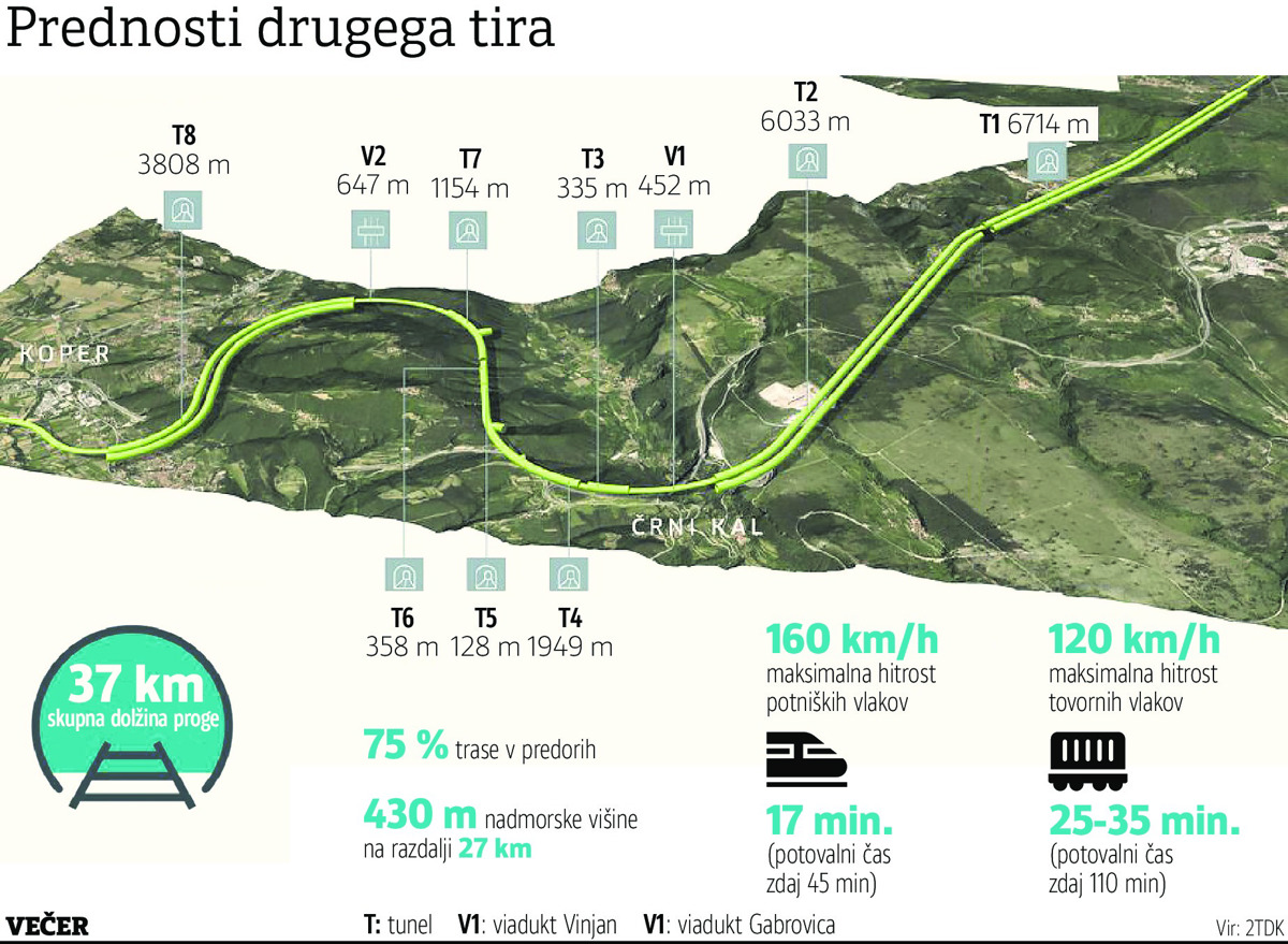 Po četrt stoletja priprav in zapletov se je s podpisom pogodb z izvajalci glavnih del pri projektu Drugi tir med Divačo in Črnim Kalom gradnja le začela na celotni trasi. Kot je znano, je oba posla dobil domači gradbinec Kolektor CPG. S turškima podjetjema Yapi Merkezi in Özaltin bo za 403,6 milijona evrov zgradil odsek Divača-Črni Kal. Glavna dela na odseku med Črnim Kalom in Koprom, ki že tečejo, pa bo opravil za 224,7 milijona evrov. Potem ko so nadzorniki družbe 2TDK potrdili novelirani investicijski program, znaša po novem nižja ocenjena vrednost drugega tira 997 milijonov evrov, to je za 50 milijonov evrov manj. Trasa bo dolga 27,1 kilometra, na njej bo kar osem predorov, dva viadukta in ena galerija.