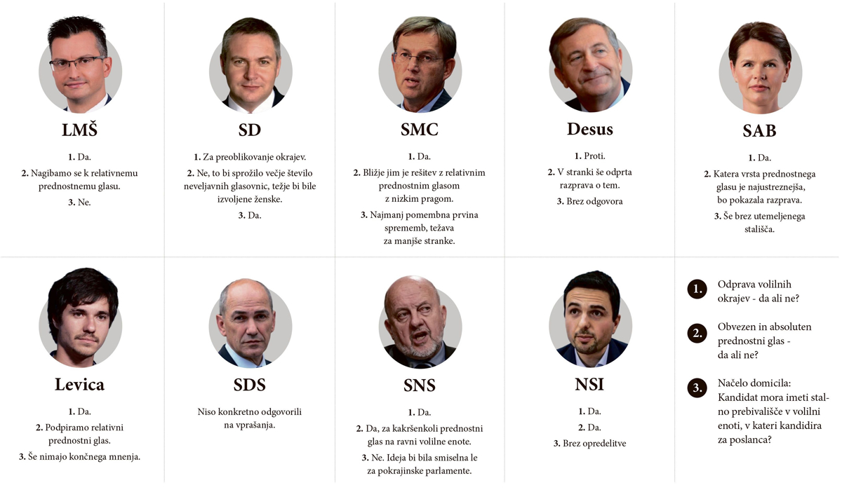 SDS, brez podpore katere bodo spremembe ustave zelo težke, na vprašanja ni odgovorila. Iz stranke Janeza Janše so sporočili le: "Podpiramo vsako spremembo volilnega sistema, ki povečuje vpliv volivca na izvolitev poslanca in hkrati zmanjšuje centralizacijo države." Novembra 2013 je SDS sprožila postopek za spremembo ustave, ki bi določala, da bi 88 poslancev volili po dvokrožnem večinskem volilnem sistemu. Druga večja neznanka je bila doslej SD, ki ukinitvi volilnih okrajev ni naklonjena, a dodaja: "Smo za enostavne oblike glasovanja, ki so razumljive vsakemu volivcu in ne zapletajo ugotavljanja volilnega izida. Tudi v primeru, če bi se volilna zakonodaja spreminjala v smeri ukinitve volilnih okrajev."