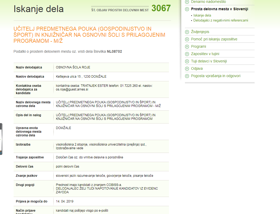 Do 14. aprila se lahko na razpis Osnovne šole Roje v Domžalah prijavi učitelj, ki bo poučeval gospodinjstvo in šport ter hkrati opravljal delo knjižničarja. To ni prvi tak razpis v naših šolah, nazadnje so na eni izmed šol za njihov vrtec iskali celo pomočnico vzgojiteljice in čistilko hkrati kar za nedoločen čas. Da gre za napako, so se običajno odzvali na osnovnih šolah, ko so jih opozorili, da osebe, ki jo iščejo, niti teoretično ni mogoče najti. Običajno so potem objavili ločene razpise.