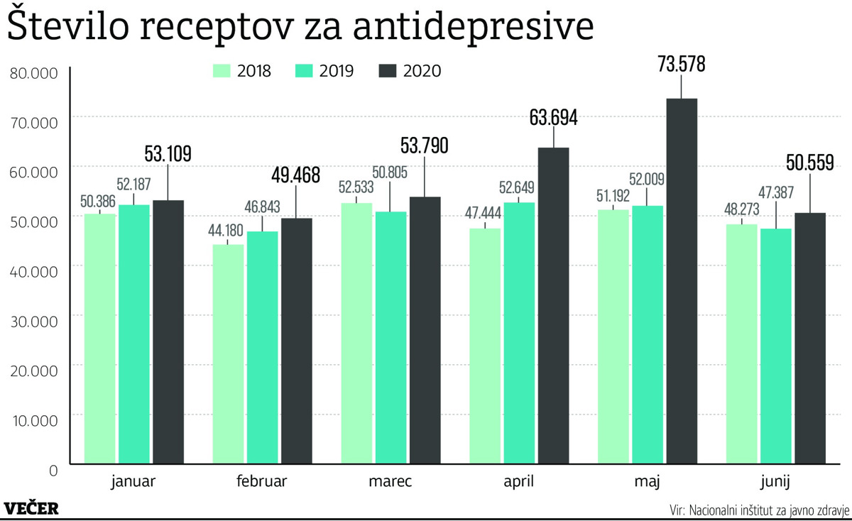 Če pogledamo podatke NIJZ o porabi antidepresivov v letošnjih spomladanskih mesecih in jih primerjamo z enakim obdobjem v preteklem letu, je slika precej zgovorna. Marca je bilo izdanih okoli pet odstotkov antidepresivov več kot marca lani, aprila za 21 odstotkov več, maja kar za 41 odstotkov in junija za šest odstotkov več. Pogled v lansko obdobje, kako so po regijah prebivalci posegali po antidepresivih, razkriva, da je bilo največ antidepresivov predpisanih v zasavski regiji (8,4 odstotka), kjer se tudi kaže največji porast predpisovanja – kar 0,3 odstotka od leta poprej. Sledita goriška (7,9 odstotka) in koroška regija (7,8 odstotka), osrednjeslovenska regija je najnižje na lestvici (6,6 odstotkov). Povprečno je antidepresive prejemalo 7,1 odstotka slovenske populacije, kar je za 0,1 odstotka več kot leto prej.