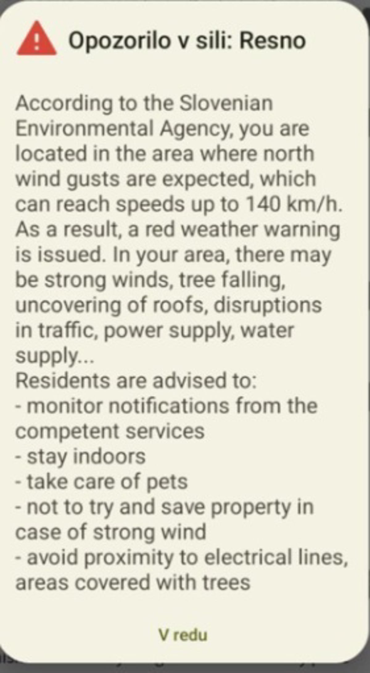 Poveljnik civilne zaščite Šestan je zato vse prebivalce in ostale na teh območjih pozval k previdnosti. "Da ne zapuščajo zaprtih površin, da predmete, ki jih lahko zavarujejo, zavarujejo, odstranijo ali kako drugače preprečijo, da jih veter odnaša in s tem povzroča nevarnost za druge objekte in tudi za ljudi," je dejal Šestan.