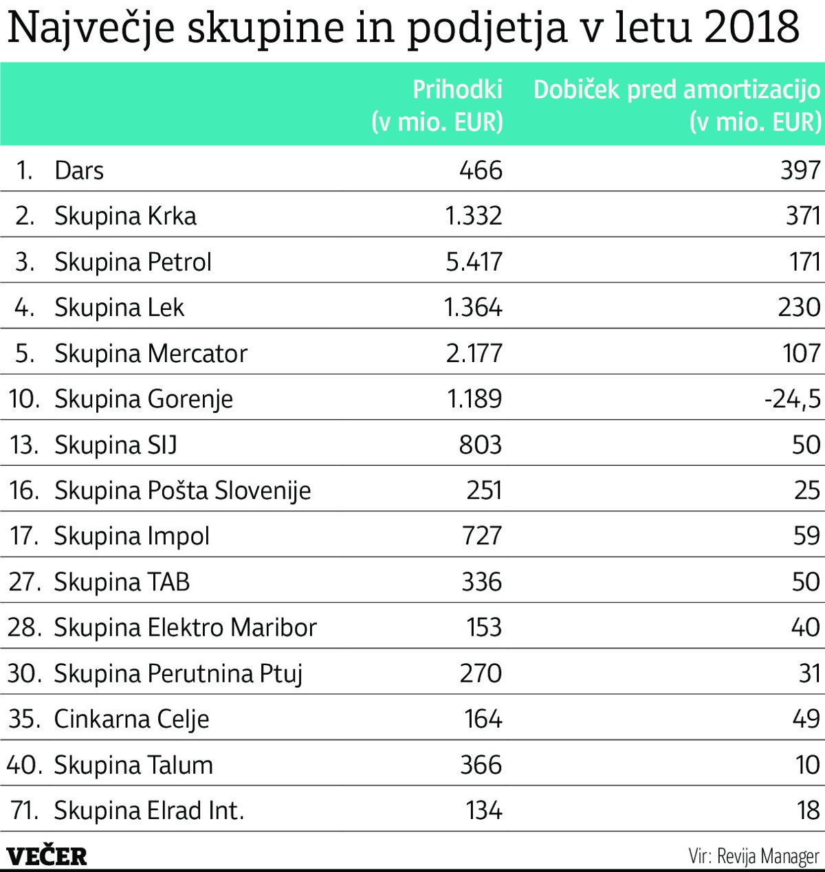 Revija Manager je v posebni izdaji TOP 101 - Skupine analizirala največje skupine v Sloveniji in sestavila tudi lestvico najboljših poslovnih skupin in podjetij preteklega leta. Med drugim ugotavljajo, da so najuspešnejša slovenska velika podjetja in skupine lani ustvarili štiri tisoč novih delovnih mest. Dobiček iz poslovanja pred amortizacijo (EBITDA) pa je zrasel dvakrat toliko, kot znaša slovensko povprečje. V Sloveniji je sicer le 419 velikih skupin oziroma 0,6 odstotka vseh podjetij, kljub temu ima vsak tretji zaposleni službo v veliki družbi. Te prispevajo vsak drugi evro prihodka slovenskega gospodarstva, ustvarijo 61 odstotkov prihodkov na tujem, dosegajo polovico od lanskih 4,2 milijarde evrov čistega dobička in 55.679 evrov dodane vrednosti na zaposlenega, kar je precej nad povprečjem, ki znaša 44.415 evrov, še ugotavljajo.