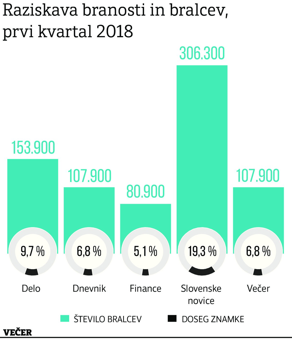 Sveži podatki o branosti kažejo, da tiskane izdaje vseh dnevnikov - poleg Večera še Dnevnika, Dela, Financ in Slovenskih novic - dosežejo 475.000 bralcev, ki preberejo vsaj en časopis. Tistih, ki v roke vzamejo vsaj eno od 140 v raziskavo zajetih slovenskih tiskanih edicij, pa je kar dober milijon in pol.