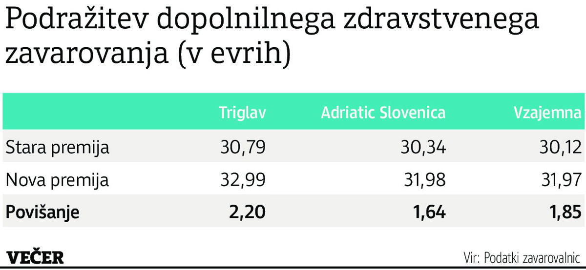 Vse tri zavarovalnice, ki ponujajo dopolnilno zdravstveno zavarovanje - Vzajemna, Adriatic Slovenica in Triglav, Zdravstvena zavarovalnica -, bodo z marcem zvišale zavarovalne premije. Za dopolnilno zdravstveno zavarovanje bomo tako plačevali od 1,64 do 2,20 evra več na mesec. Največ bo po novem treba odšteti za zavarovanje pri Triglavu, kjer imajo okoli 360 tisoč zavarovancev - 32,99 evra na mesec oziroma za 2,20 evra več. Najmanj, za 1,64 evra (na 31,98 evra), se bo premija zvišala pri Adriatic Slovenici, kjer ima dopolnilno zdravstveno zavarovanje sklenjeno tudi najmanj zavarovancev, okoli 277 tisoč. Pri Vzajemni imajo največ zavarovancev, okoli 850 tisoč, premijo pa bodo povišali za 1,85 evra in bo znašala 31,97 evra. Nove premije bodo prvič obračunane že konec februarja, saj se plačujejo v tekočem mesecu za naslednji mesec.