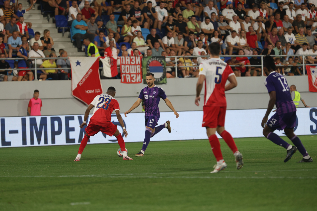 Precej drugače kot v Ljudskem vrtu se je postavila Vojvodina, ki je pred tednom dni v prvem delu prepustila pobudo vijoličastim. Tokrat pa je hitro razmerja na igrišču obrnila sebi v prid. Da bo Voša, kot ji pravijo vojvodinski navijači, nevarnejša, je nakazal Vukan Savičević. Vezist je z razdalje zadel prečko.